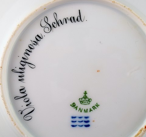 Antique Royal Copenhagen Flora Danica dessert plate. Early mark. Hand painted in highest quality. 14 cm. in diameter. Number 20/3552 Latin name: Viola uliginosa Sehrad 1. factory quality, in perfect condition.