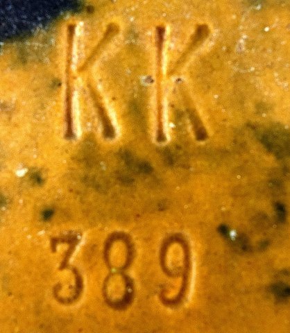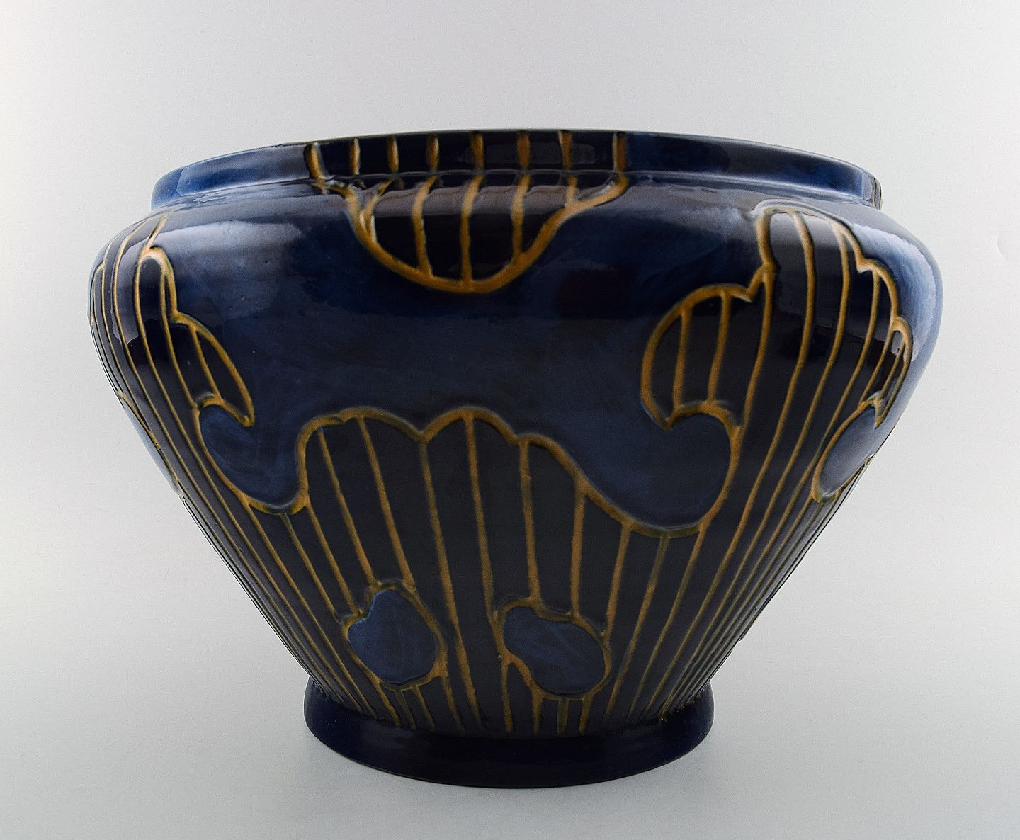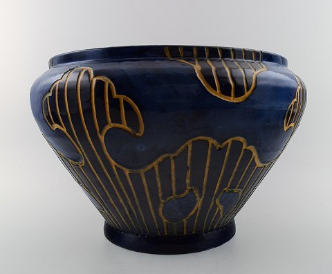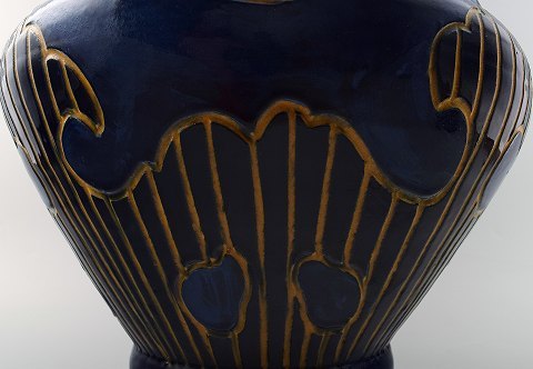 Large Danish art pottery jar, presumably Kingo. Beautiful deep blue glaze. Marked KK. Measures 33 x 23 cm. In perfect condition.