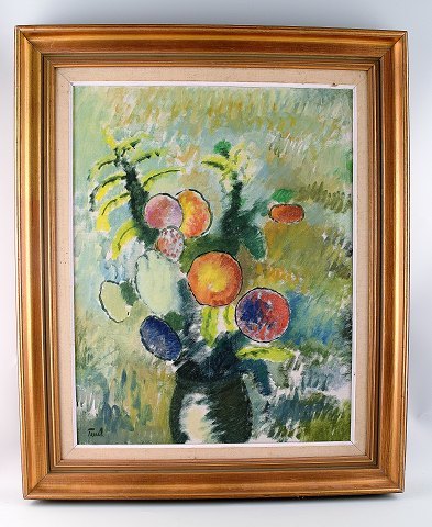 Stilleben, olie på lærred. I flot stand. Utydeligt signeret. Måler 44 x 56 cm. Rammen måler 7 cm.