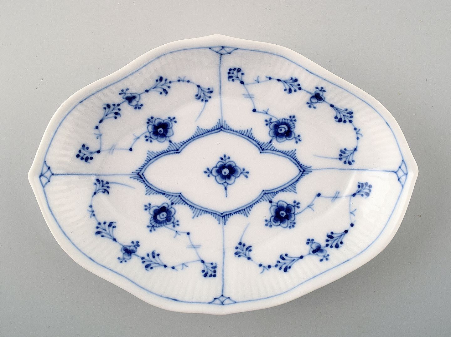 Royal Copenhagen/Kongelig Musselmalet Riflet, Oval Asiet. Dekorationsnummer 1/146 Længde 18 cm. Perfekt stand, 1. sortering. Tidligt stempel.