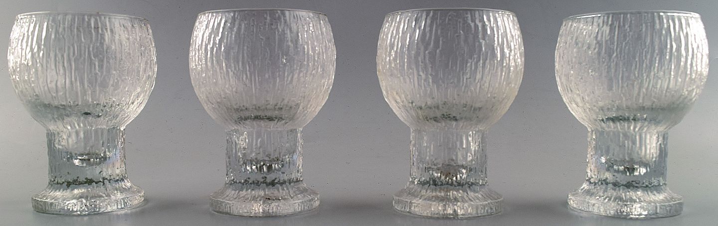 4 glasses Iittala Ultima Thule glass service, modern Finnish glass, designed by Tapio Wirkkala. In perfect condition. Measures 11 x 7.5 cm. Marked.