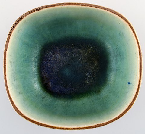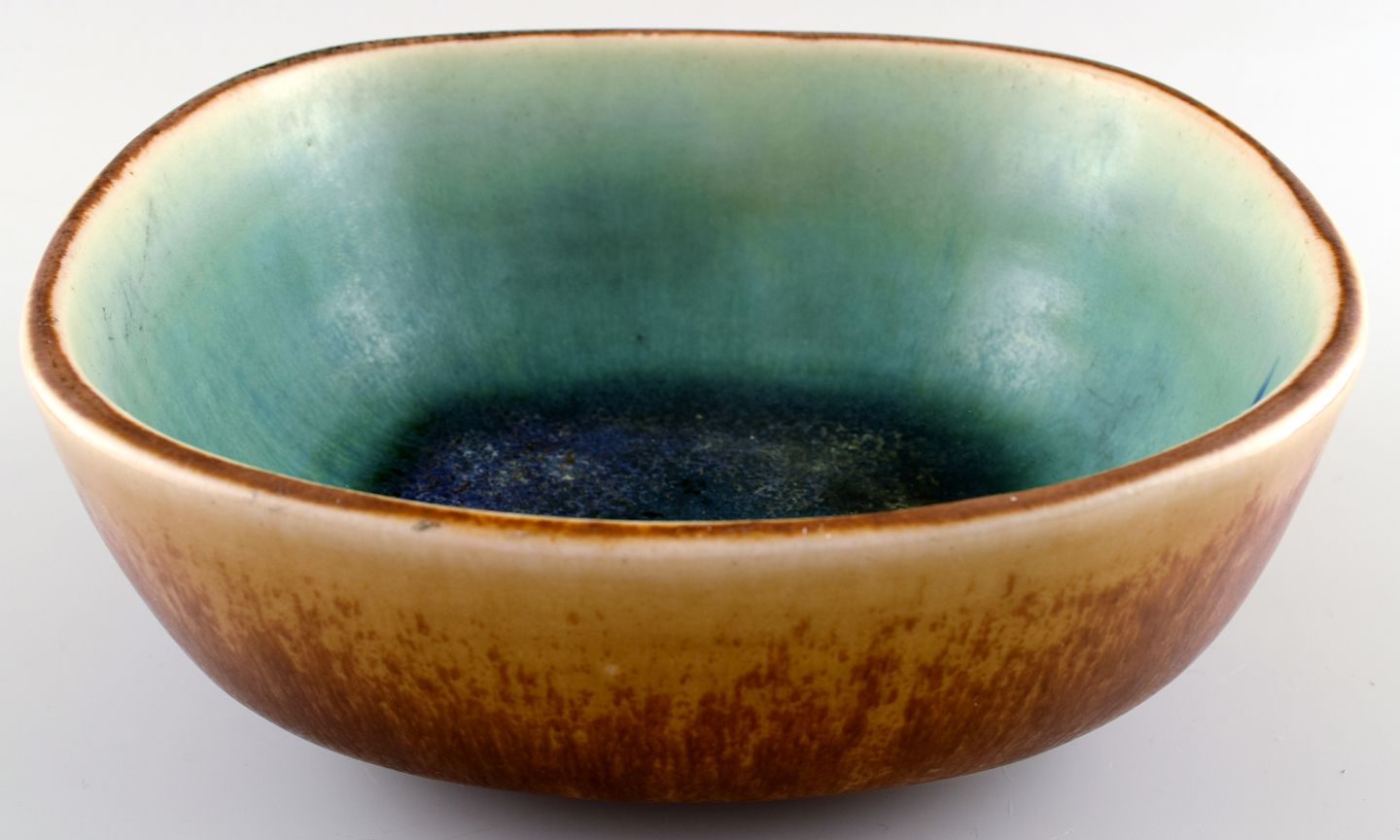 Eva Staehr Nielsen for Saxbo, ceramic bowl in modern design. Beautiful glaze in blue and green tones inside. Earth tones on the outside. Marked. Measures: 18 x 7.5 cm. In perfect condition.