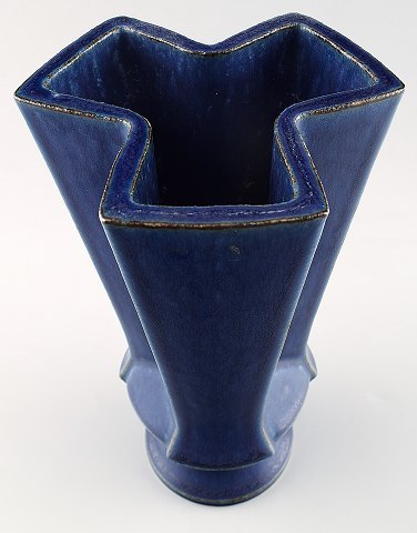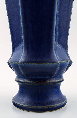 Lisa Engquist for B&G, Bing & Grøndahl. Kubistisk vase af stentøj med blå glasur. Stemplet. Højde 23 cm. 1. sortering, i perfekt stand.