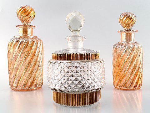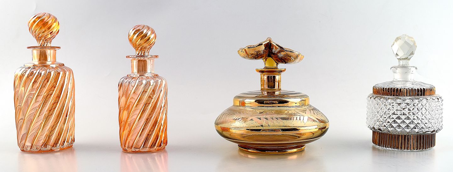 4 perfume bottles, art glass. Not stamped. In perfect condition. The largest measures 16 cm.