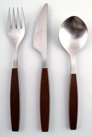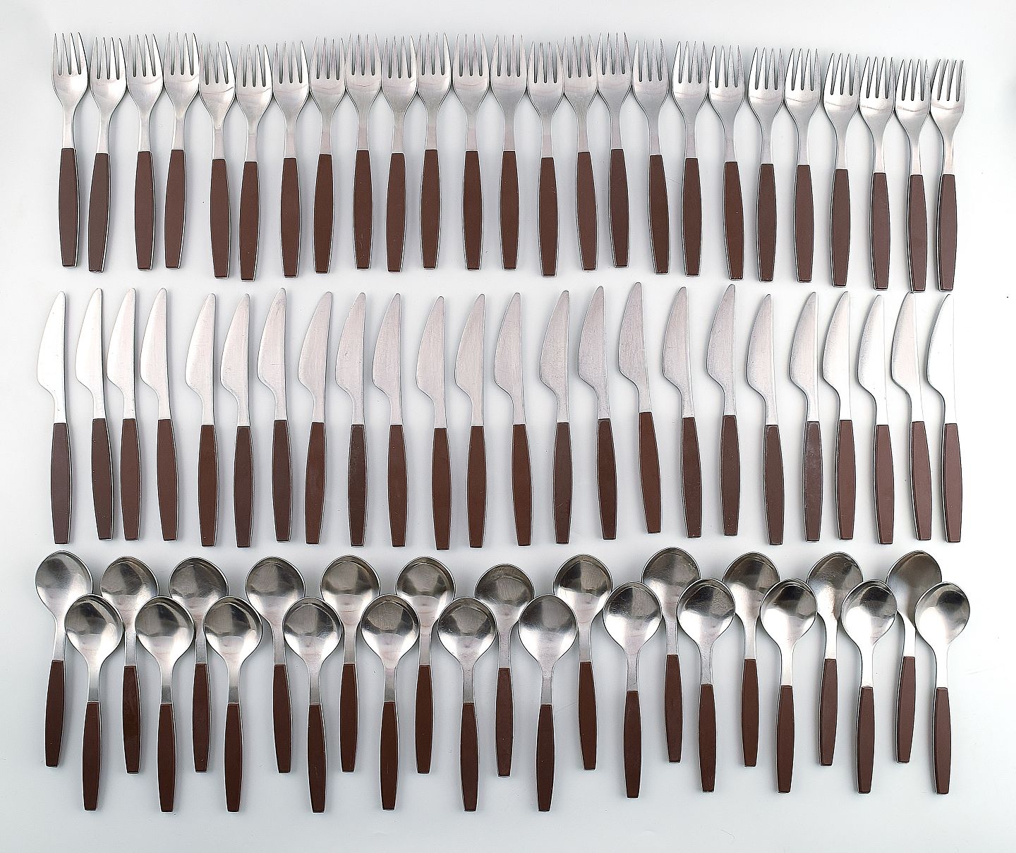 Complete service for 24 p., Henning Koppel. Strata cutlery stainless steel and brown plastic. Produced by Georg Jensen.