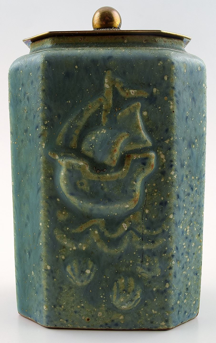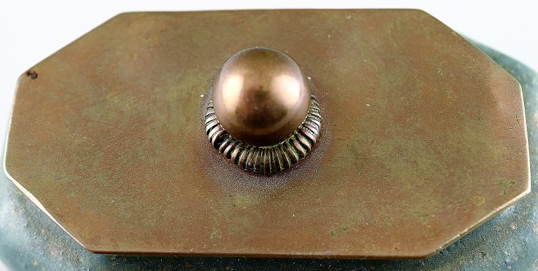 Arne Bang. Ceramic Vase with bronze lid. Stamped AB 27. Denmark 1930/40s. Glaze in shades of green. In perfect condition. Measures: 12 x 7.5 cm.