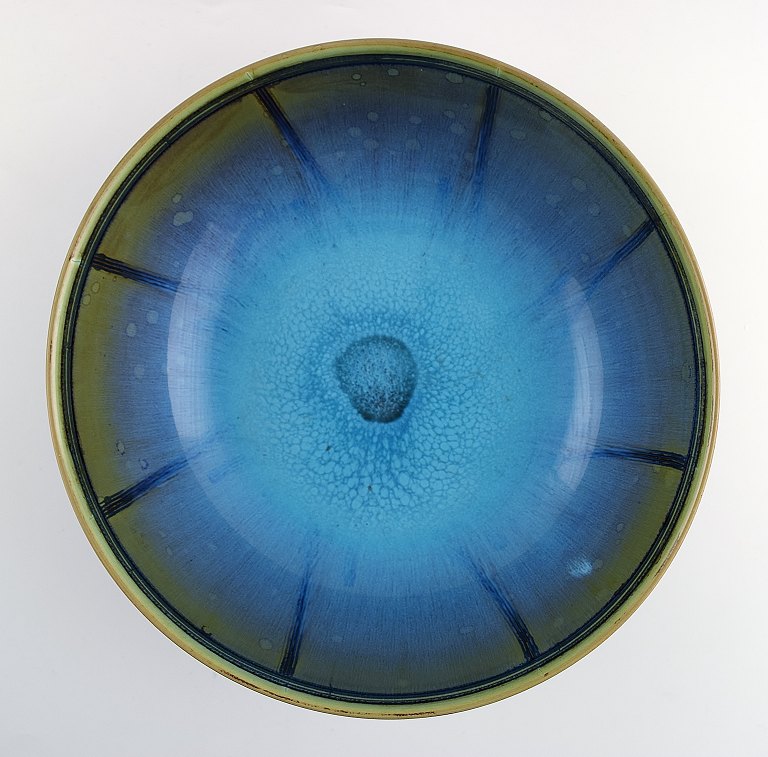 Wilhelm Kaage (1889-1960) for Farsta. Unique large bowl of stoneware on feets, decorated with blue and green glaze. Marked. Studiohand, Farsta. In perfect condition. Measures 23 x 9 cm.