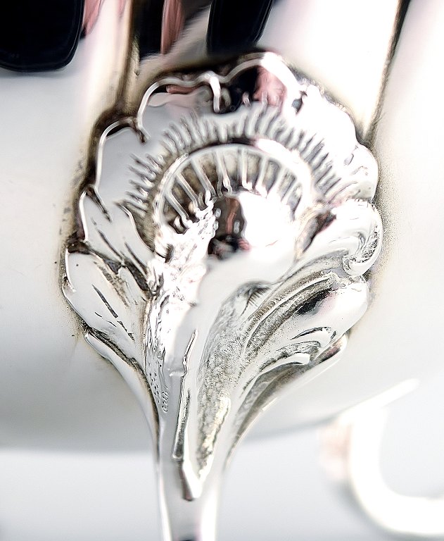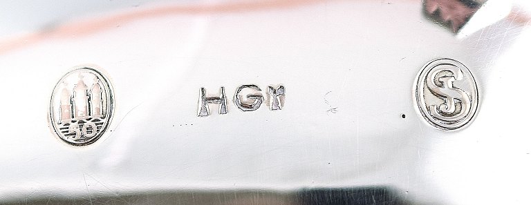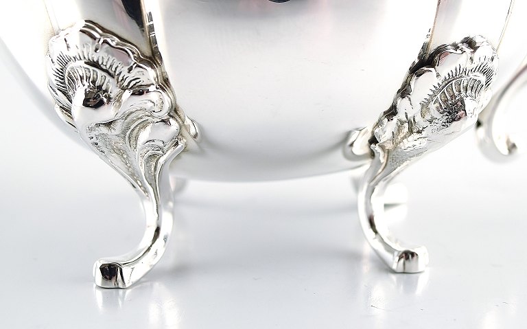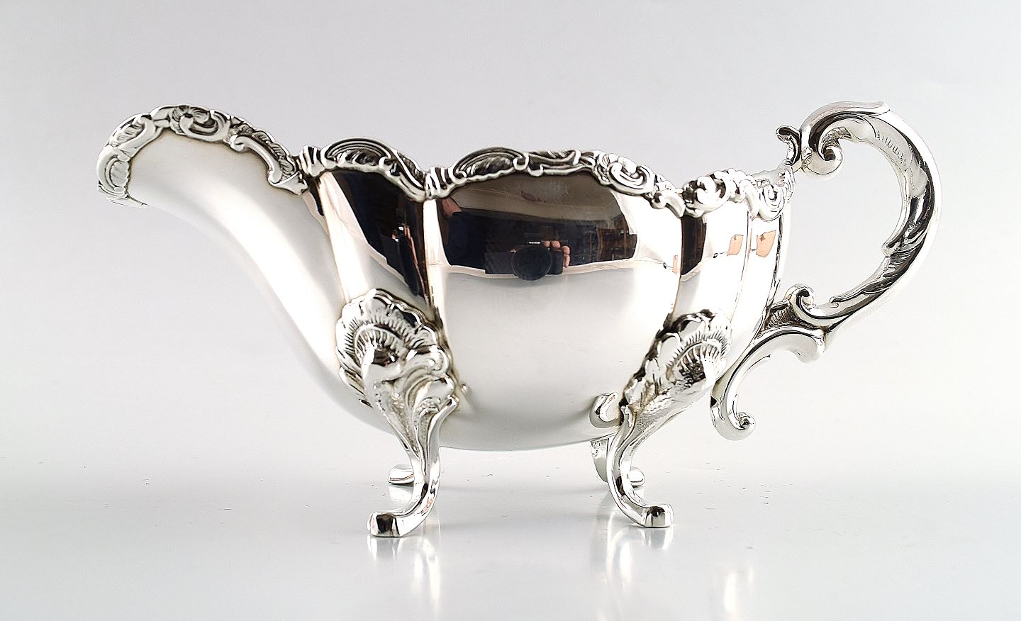 Hugo Grön 3-tårnet sølv sauce/sovsekande i rokoko stil. Danmark, ca. 1940. Måler : 15 cm. x 10 cm. Vægt 139 gram. I flot stand. Stemplet.