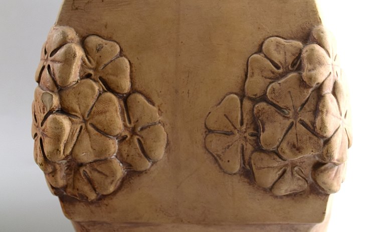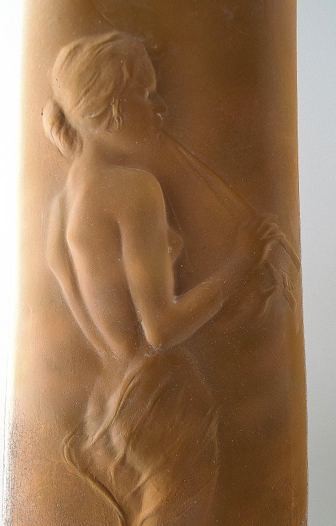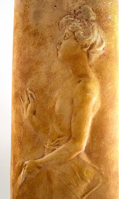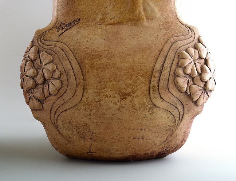A pair of very large French Art Nouveau floor vases. Terracotta / pottery. Decorated with half-naked women. Signed "Simone" and with indistinct stamp. Measures: 62 cm. x 26 cm. In very good condition.