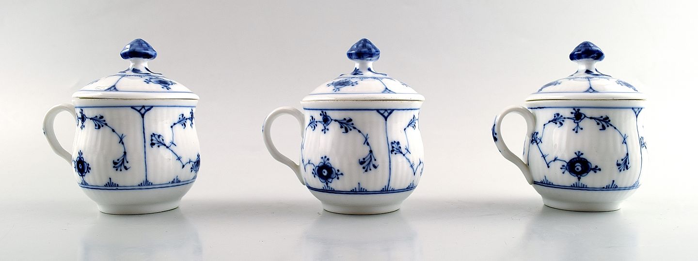3 antique Royal Copenhagen Blue Fluted plain custard/cream cups with handles. Painting Number 20, 19 c. Height 8.5 cm. Diameter 7.5 cm. Fine condition. 1st. factory quality.