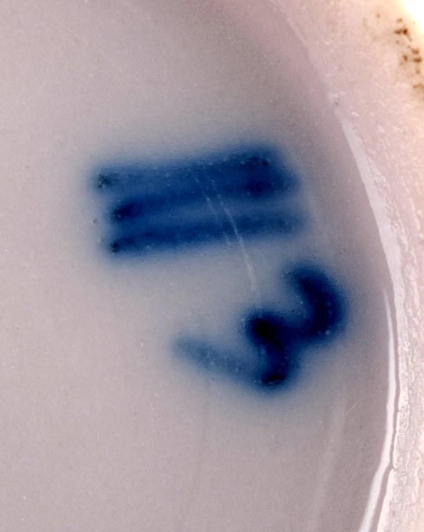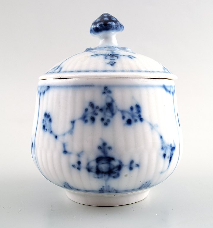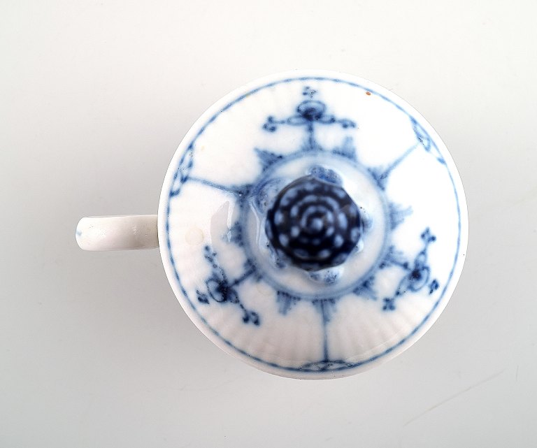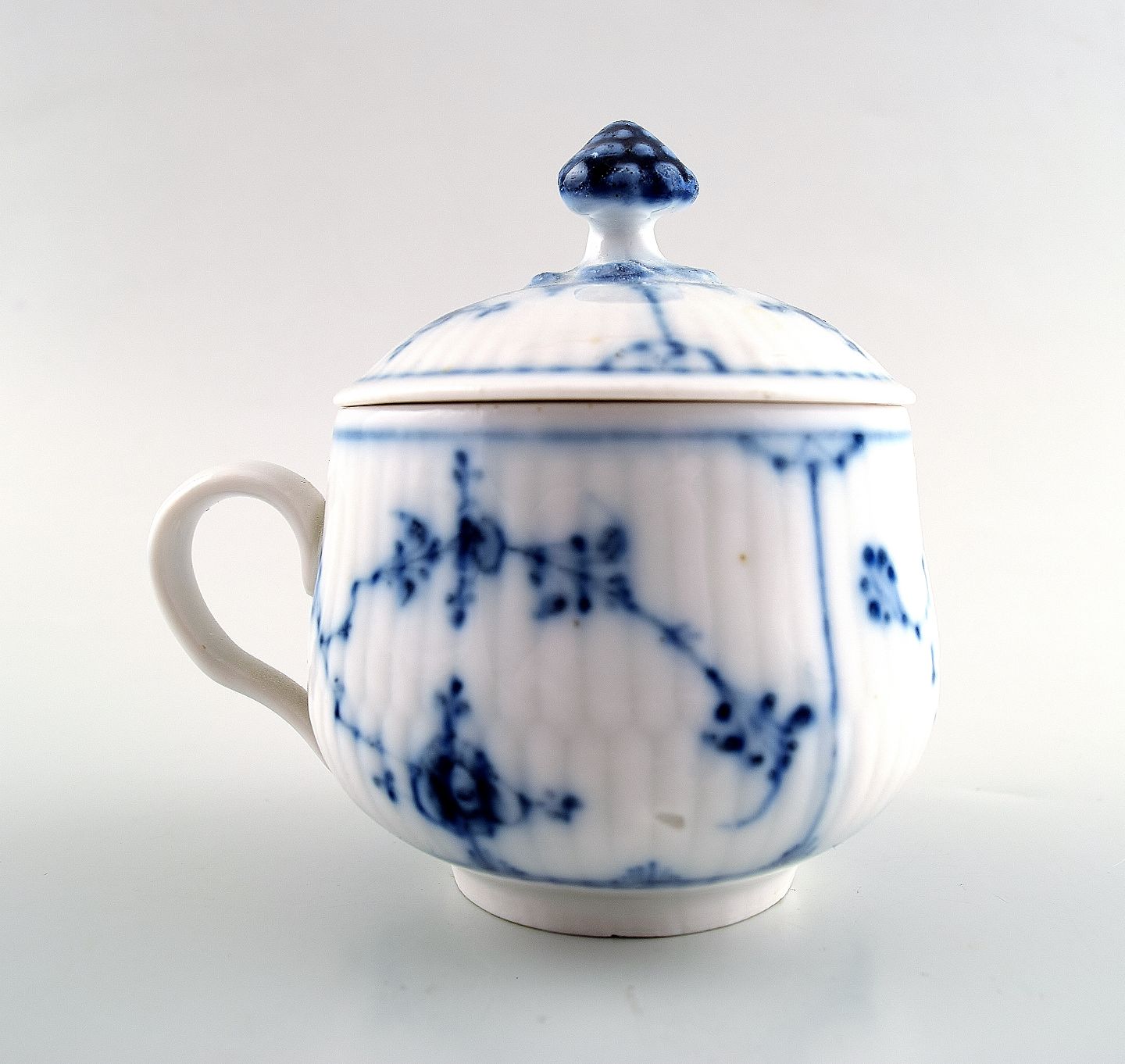 Sjælden og antik Royal Copenhagen Musselmalet riflet Cremekop med hank. Malernummer 3, tidligt 1800-tallet. Højde 9 cm. Diameter 9 cm. Fin hel stand. 1. sortering.