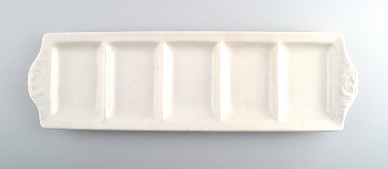 Stort Rörstrand "Perl" anretterfad/cabaretfad i hvid fajance. Måler 46,5 cm. x 14 cm. Stemplet. I perfekt stand.