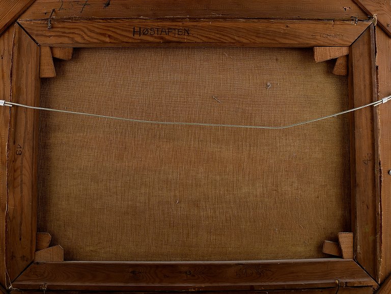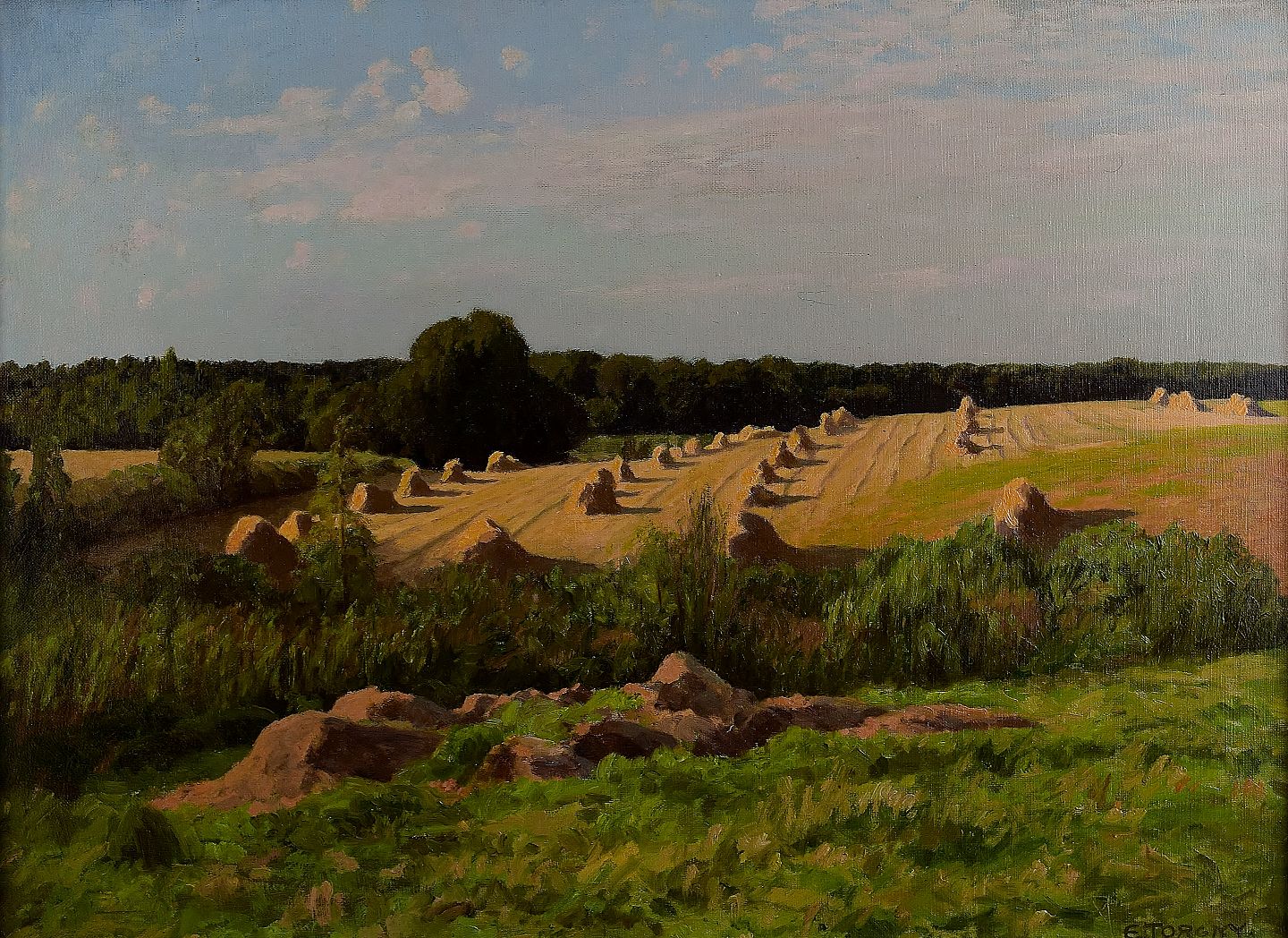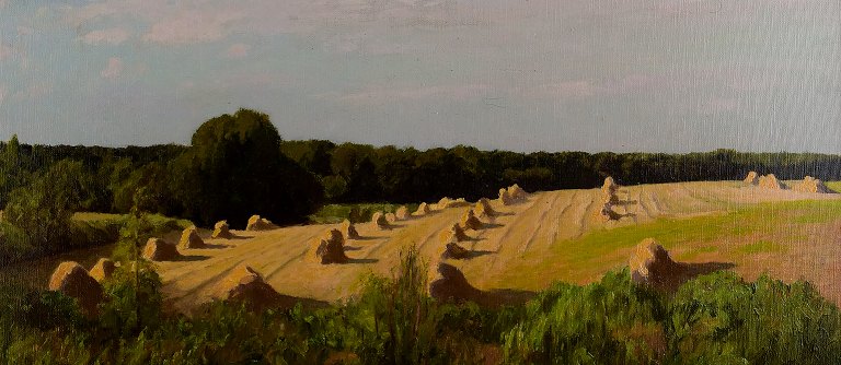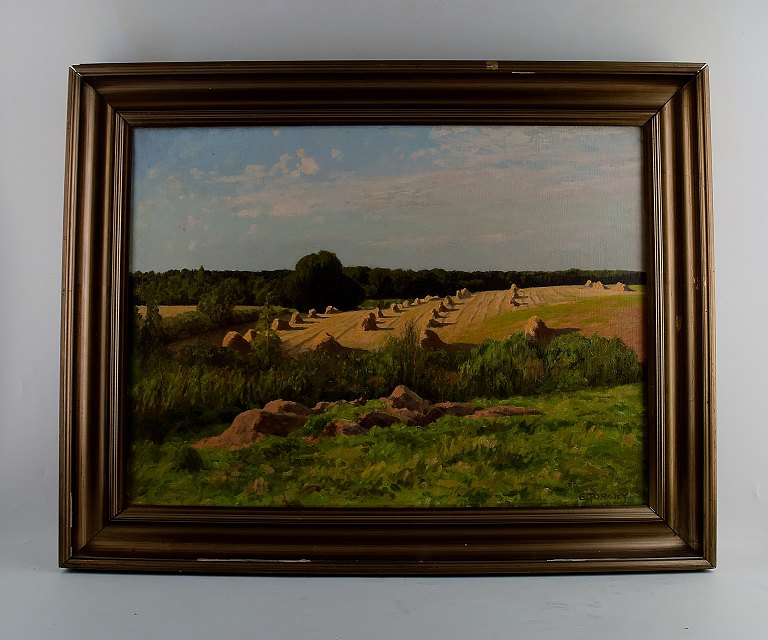 E. Torgny, dansk kunstner. Dansk sommerlandskab, oliemaleri. "Høstaften" Signeret. Midt 20 årh. I perfekt stand. Måler (Ex. rammen) 48 x 59 cm. Rammen måler 5,5 cm.