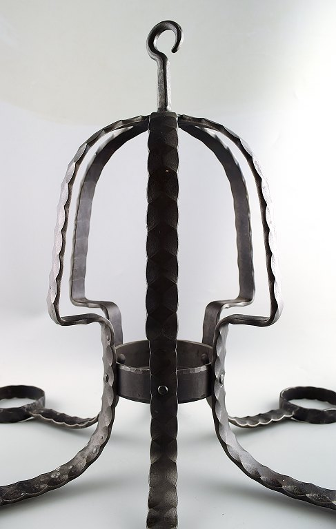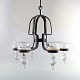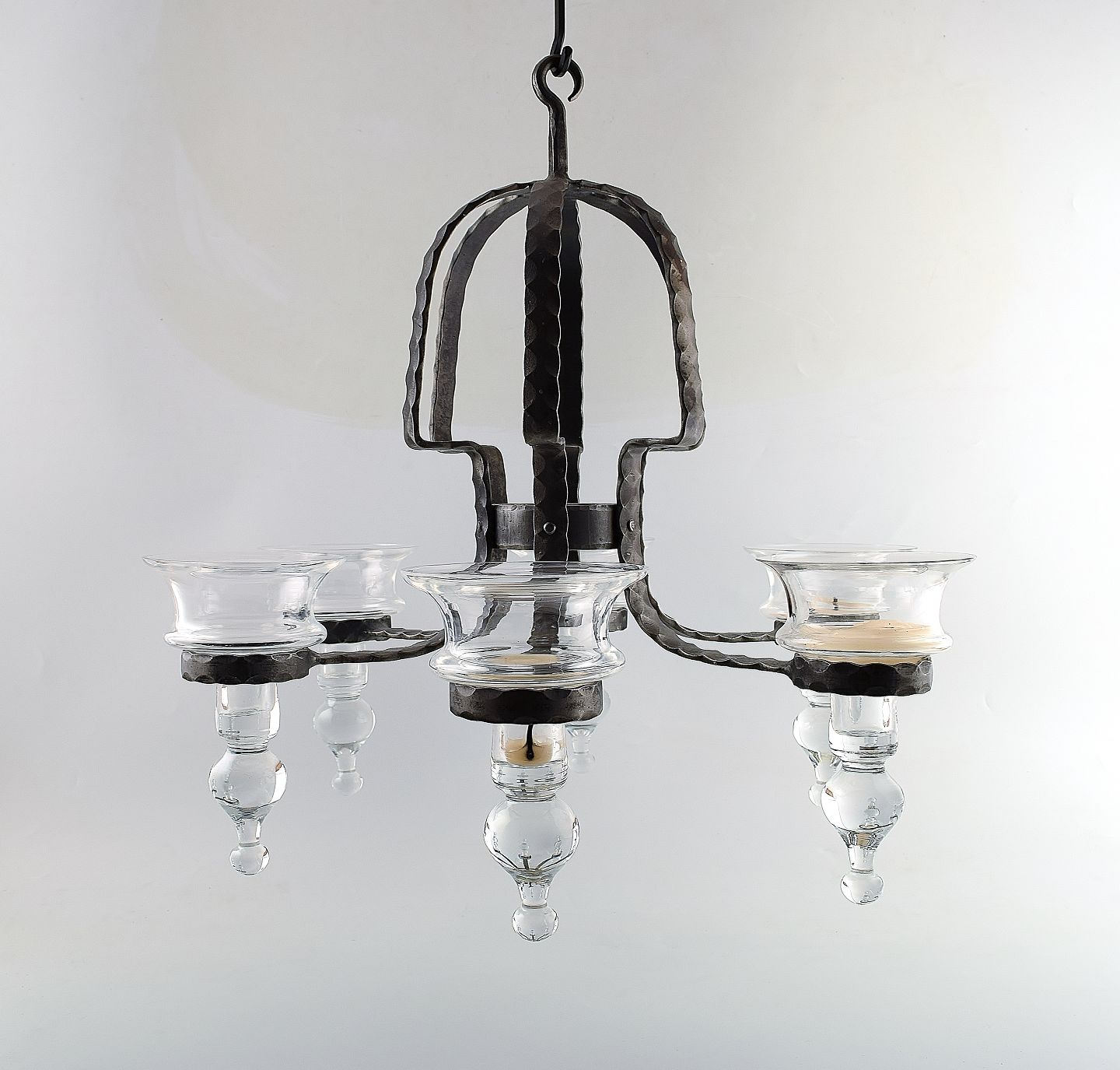 Six armed chandelier made of cast iron with art glass holders for candlelights.