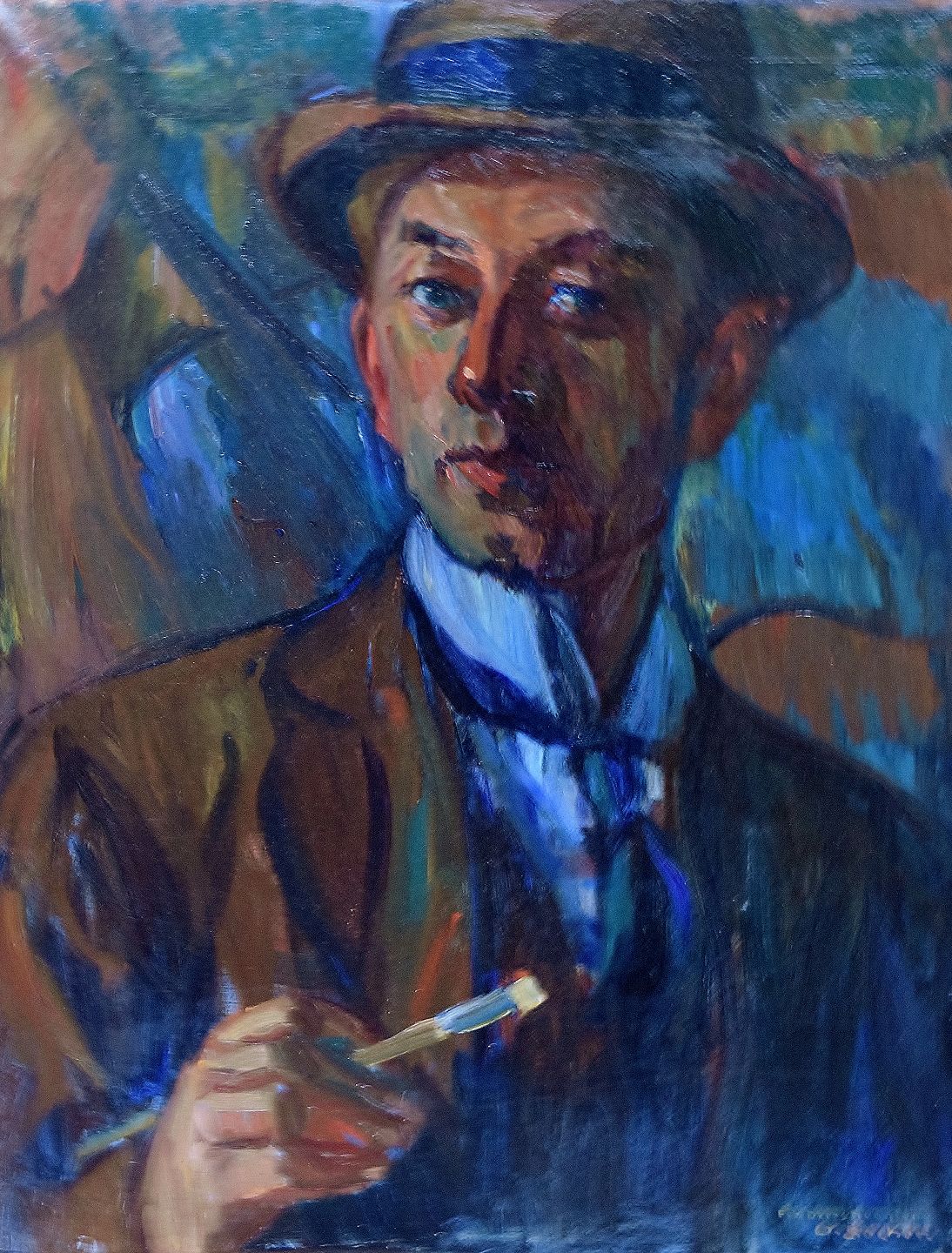 Valdemar Secher, selvportræt, olie på lærred. Signeret, ca. 1930´erne. Måler (ex. rammen) 81 x 92 cm. Rammen er 5 cm. bred og i god stand. I perfekt stand.