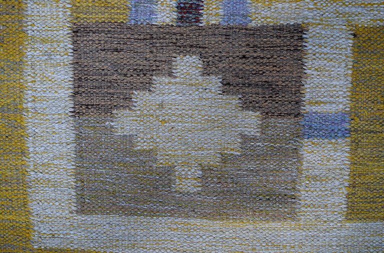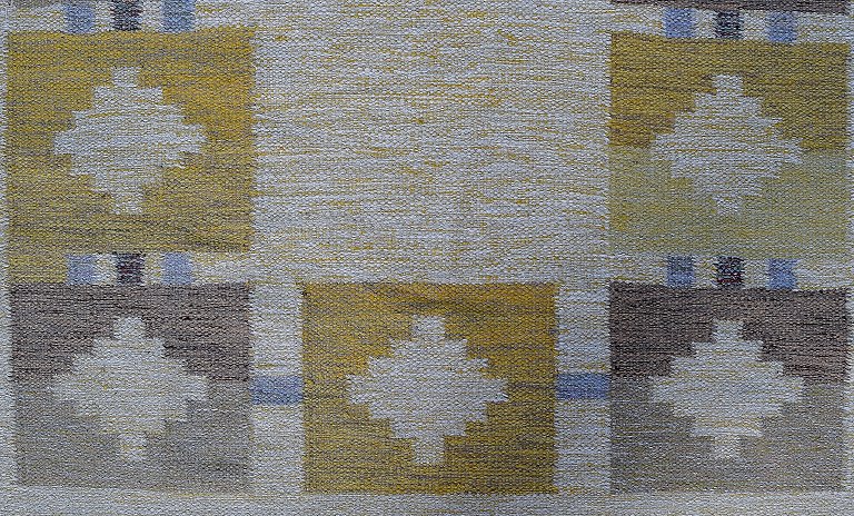 Rölakan carpet with geometric pattern in yellow and brown tones. Sweden mid 20 c. L. 225 cm. W. 175 cm. Common use signs.