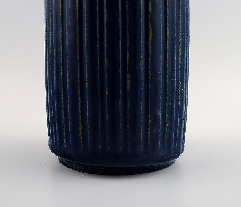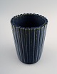 Arne Bang. Pottery vase, fluted design. Marked AB (indistinct) Beautiful glaze in dark blue shades. In perfect condition. Measures 12.5 cm. x 7.5 cm.