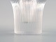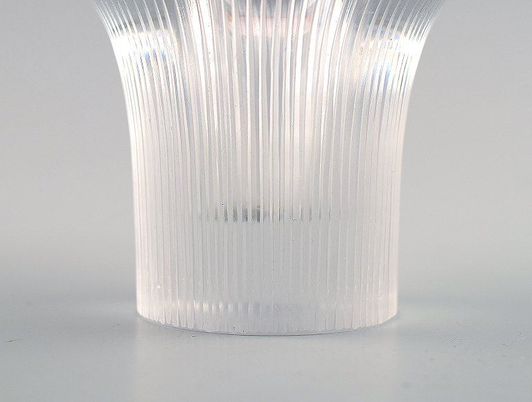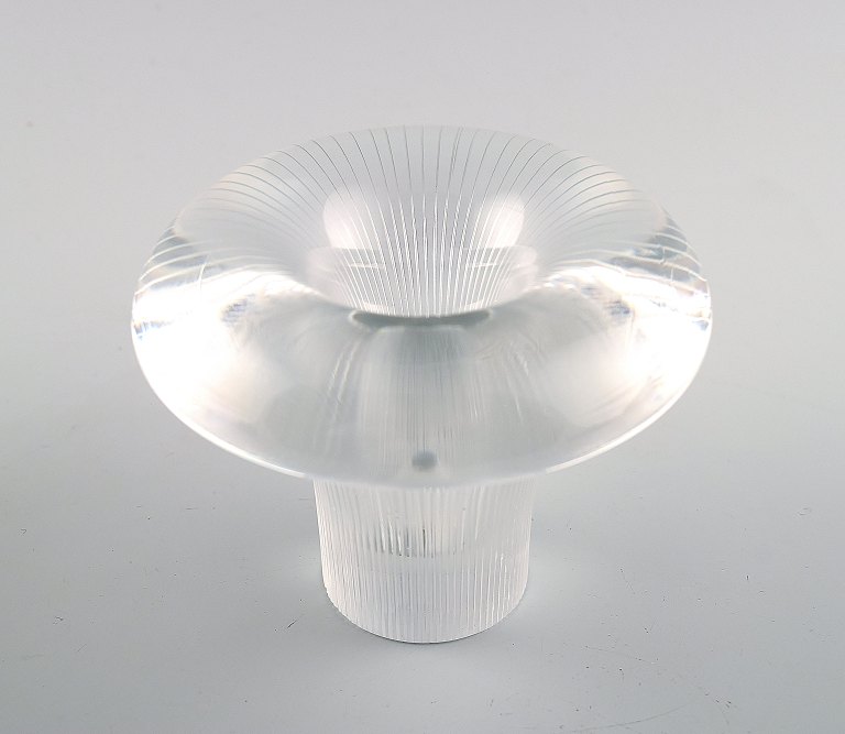 Clear glass vase shaped like a mushroom, with engraved decoration in the form of stripes.