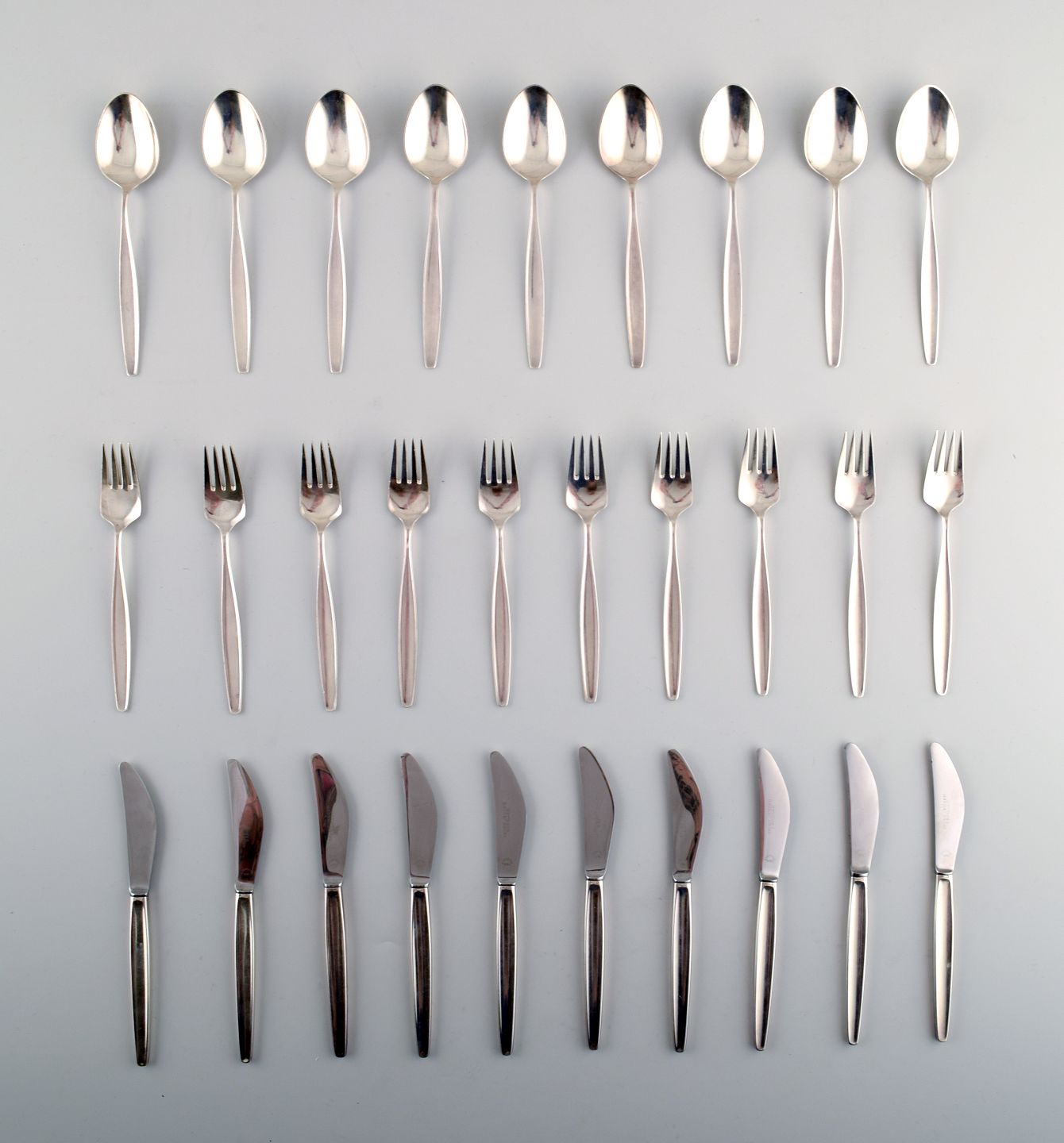 Georg Jensen Sterlingsølv 'Cypress' Bestik. Komplet Frokostservice, 30 dele til 10 pers. Bestående af : 10 Frokostknive, 10 skeer, 10 frokostsgafler. Frokostkniv måler 20 cm. I perfekt stand. Stemplet.