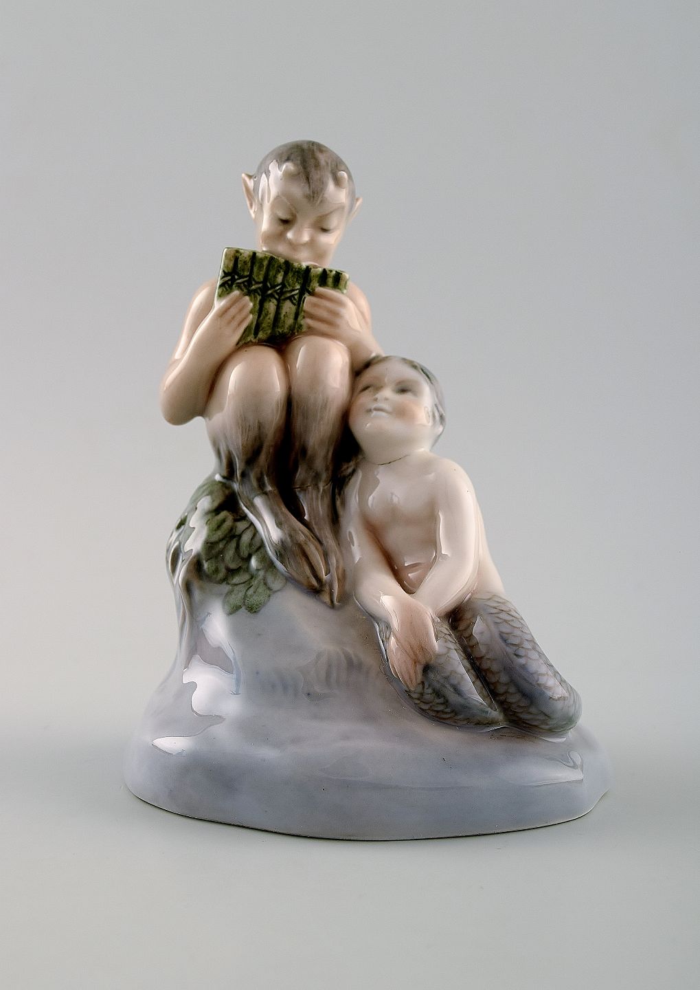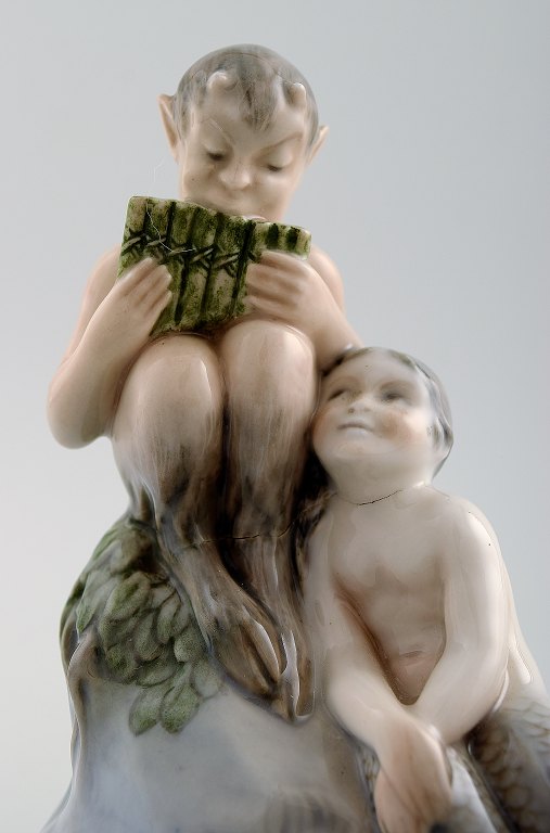 Very rare Royal Copenhagen 2299 Faun satyr with Mermaid girl. Measures : 14, 5 cm. x 12 cm. VW for V. Waldorff. Good condition, factory 2nd, burning mark on girls neck.