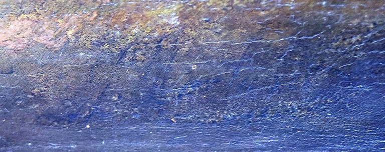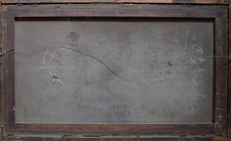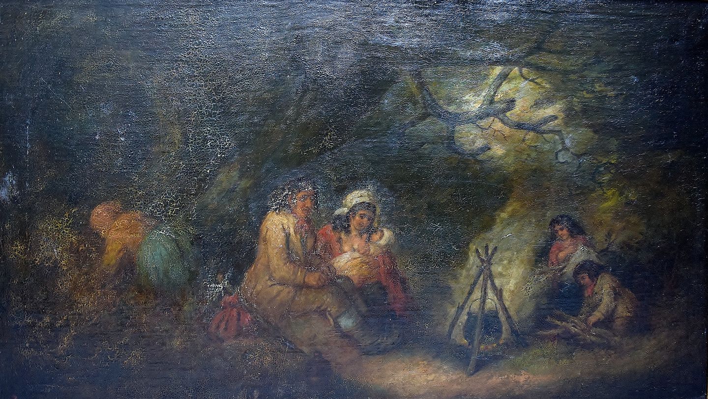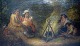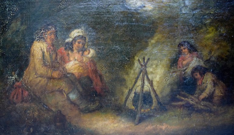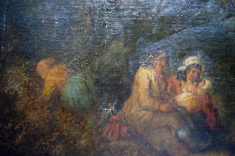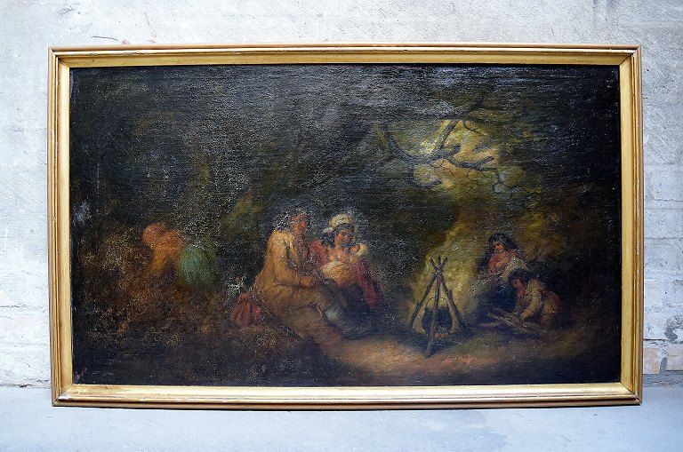 Unknown Old master. Oil on canvas, app. 1800. People around bonfire in the forest. Signed illegible. 98 x 57 (106 x 65) cm. In good condition. Crazings.