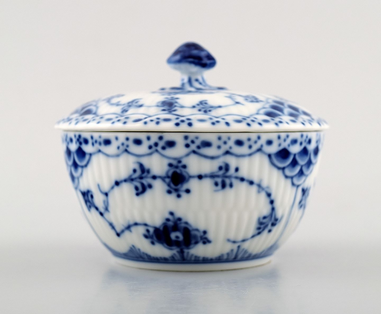 Kgl. Musselmalet halvblonde kongelig porcelæn. Royal Copenhagen Musselmalet sukkerskål nr. 657.