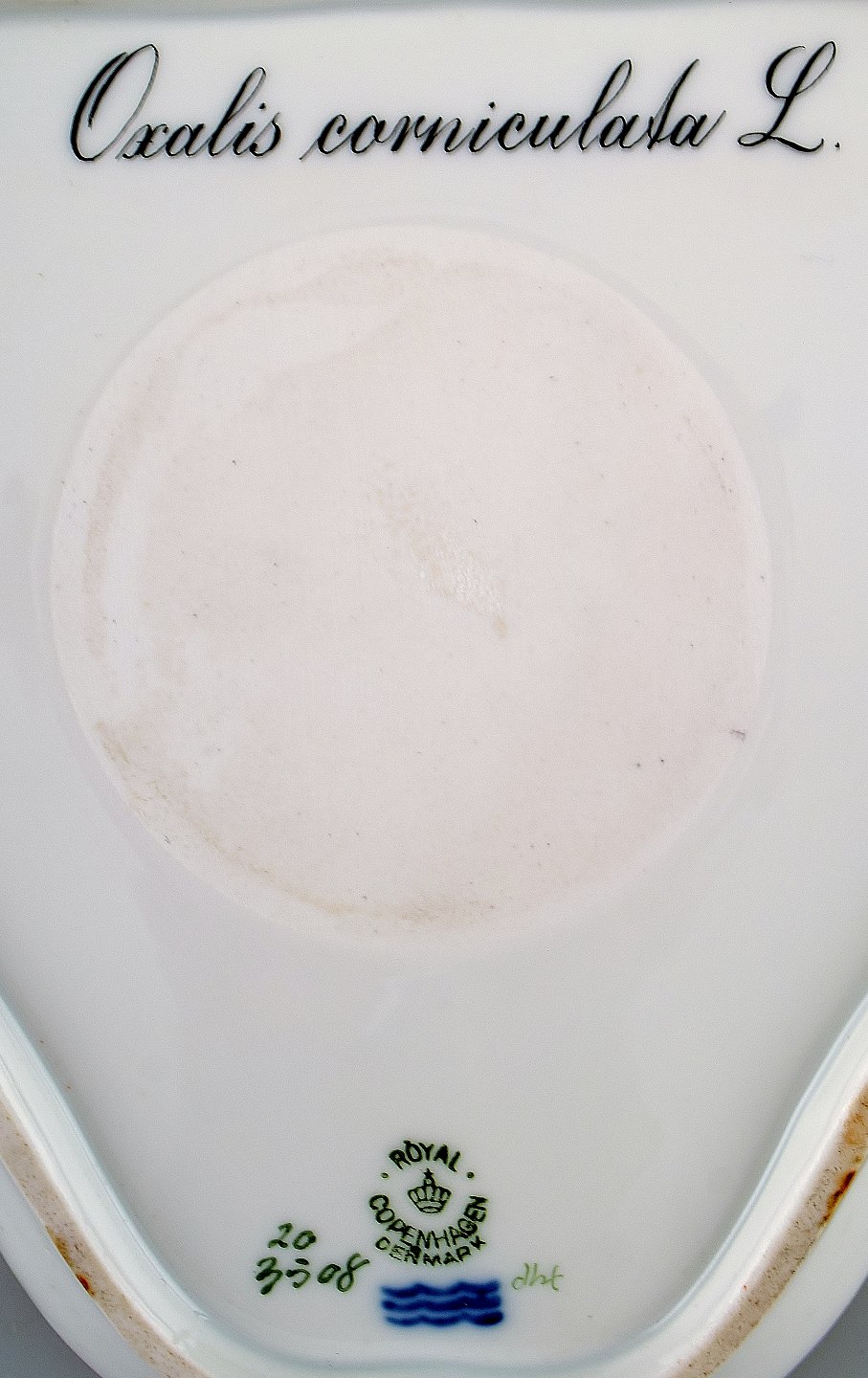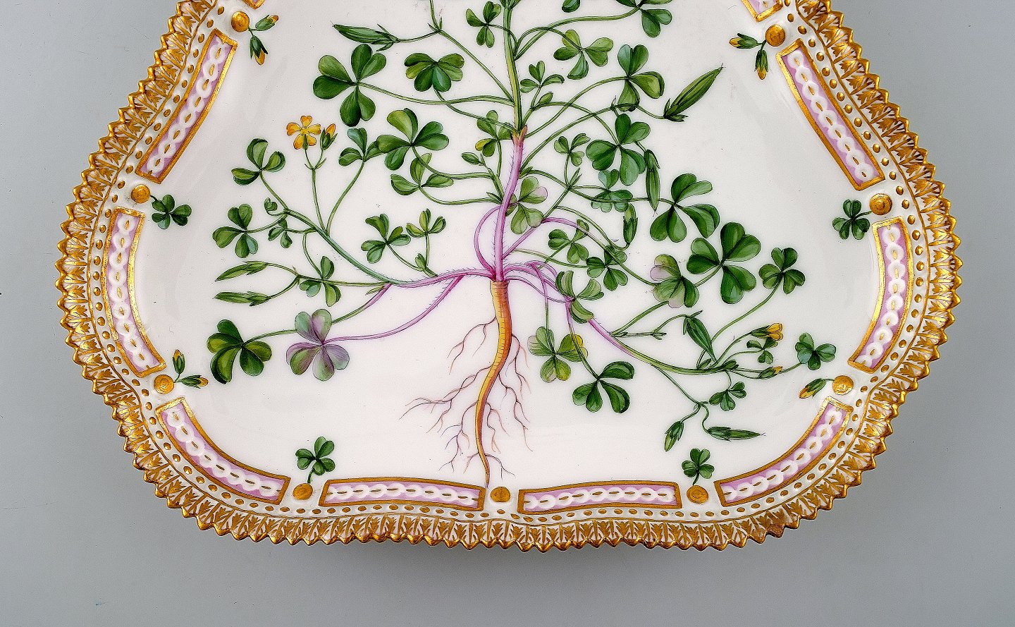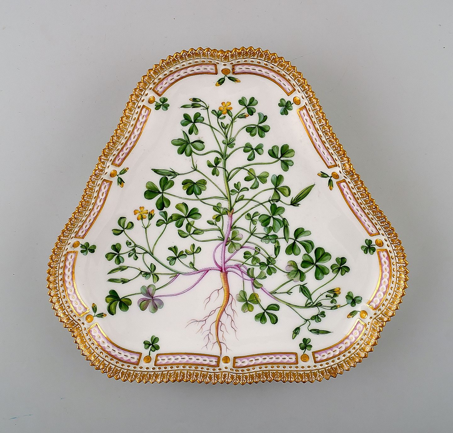 Royal Copenhagen Flora Danica" triangular porcelain dish decorated in colours and gold with flower.