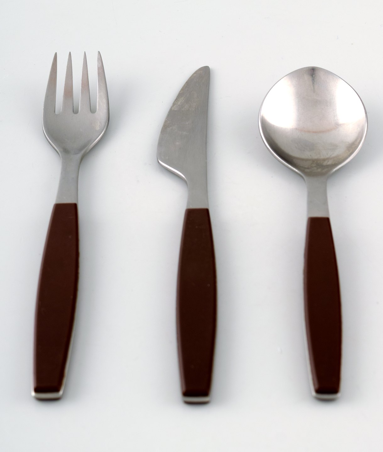 Komplet service til 4 p., Henning Koppel. Strata bestik af rustfrit stål og brun plast. Fremstillet hos Georg Jensen.