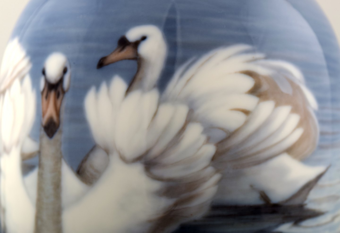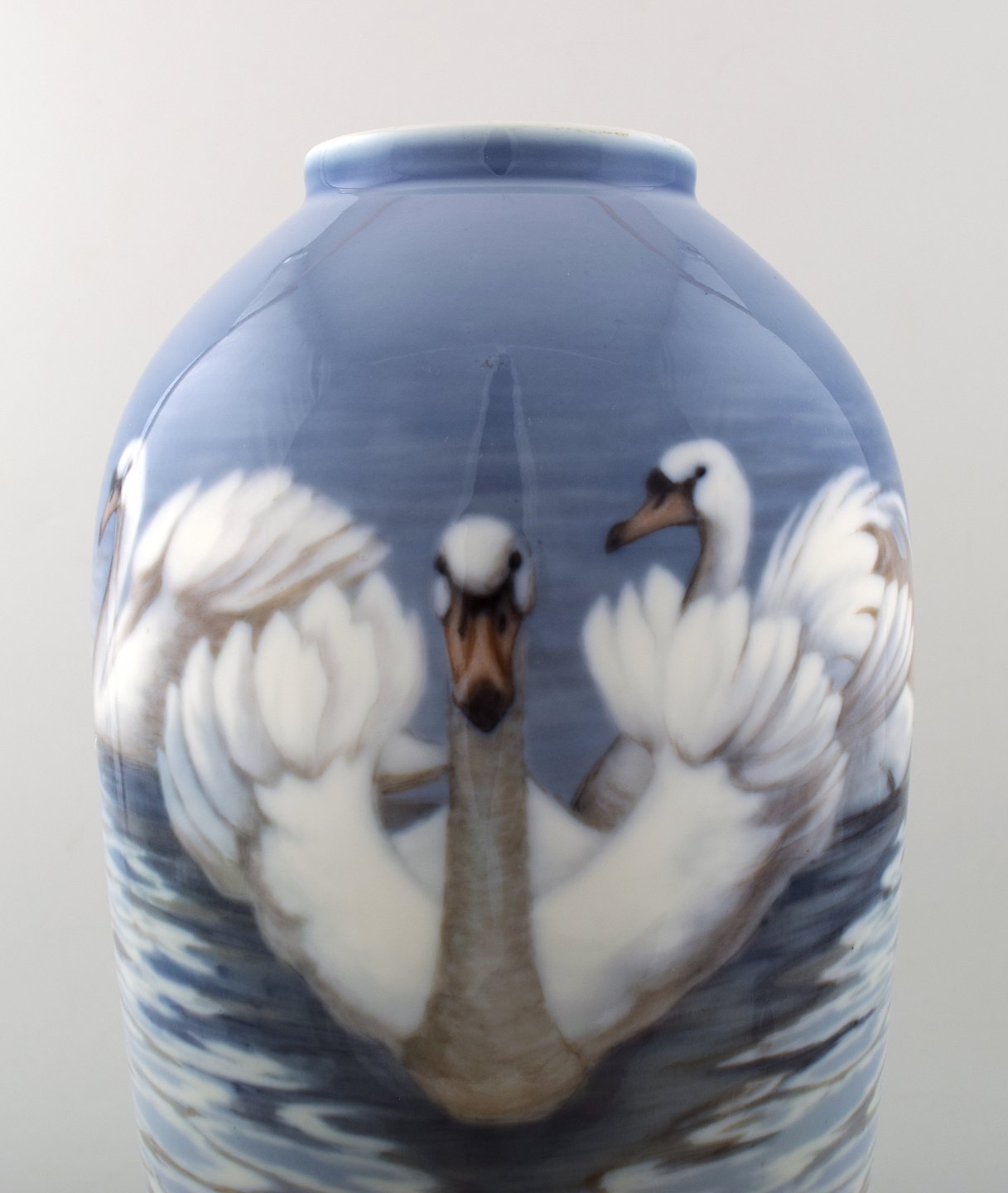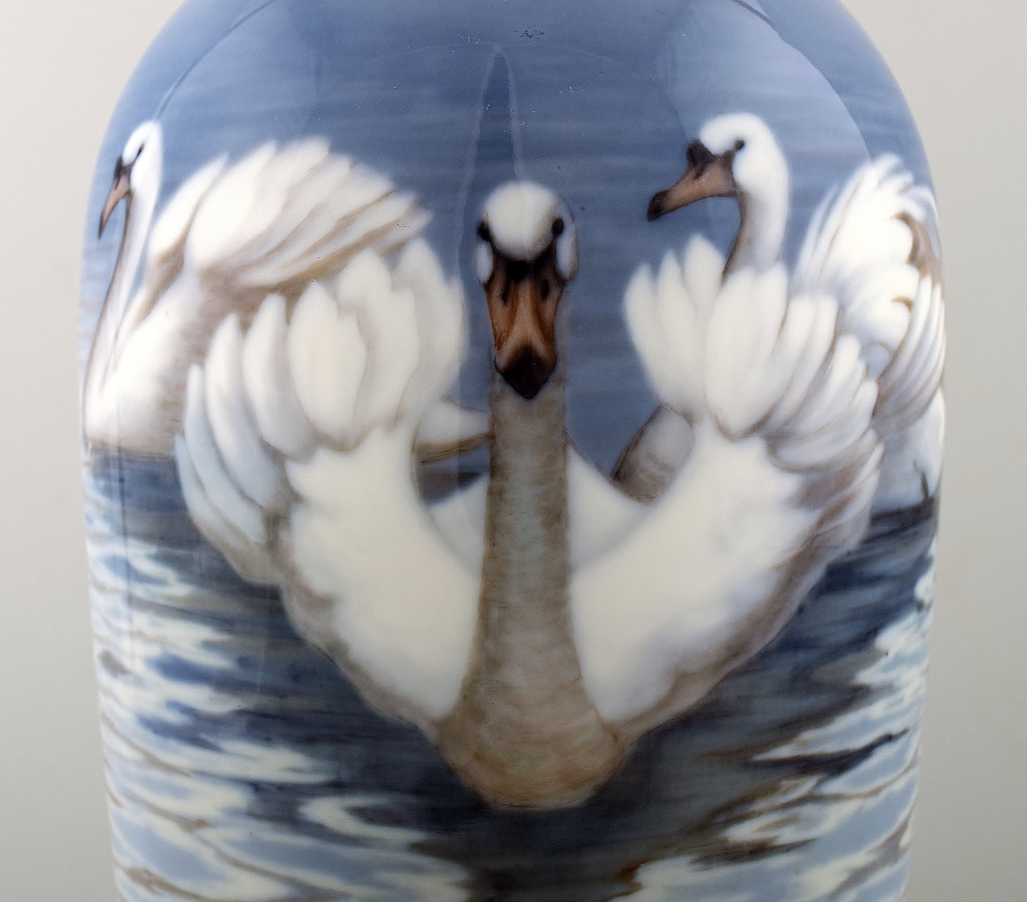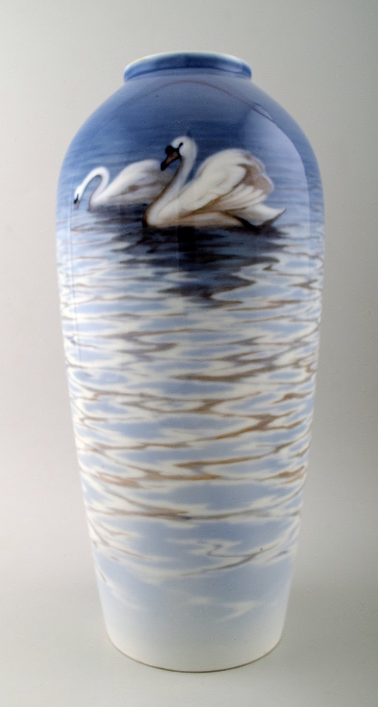 Margrethe Hyldahl (1881-1963) Large beautiful porcelain vase B&G/ Bing & Grondahl, decorated with swans. Stamped: MH, 4786/14. Measures: 38 cm. x 15 cm. 1. factory quality, in perfect condition.