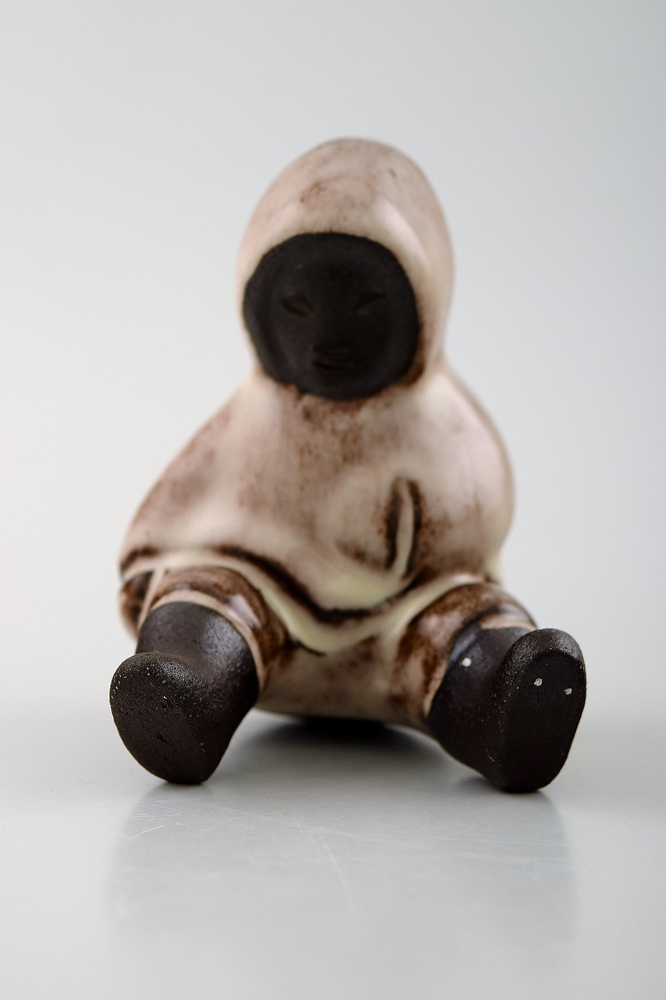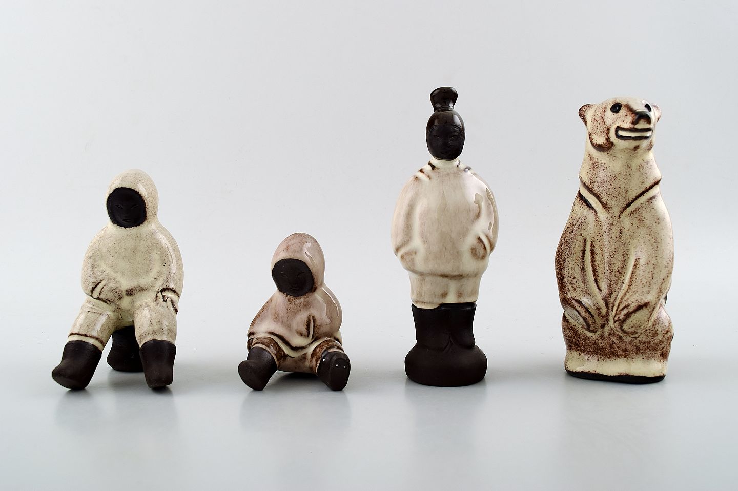Hyllested Ceramics, Keldbylille on Moen, Denmark. 3 Eskimos and a polar bear. Measures: Tallest 10 cm. In perfect condition. Marked.