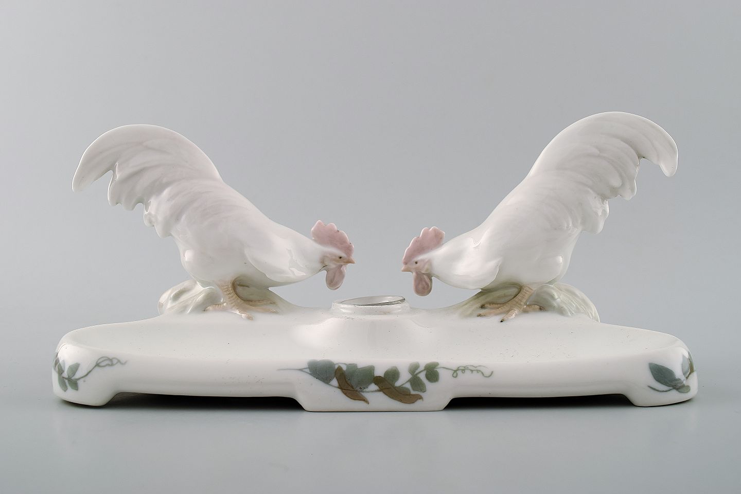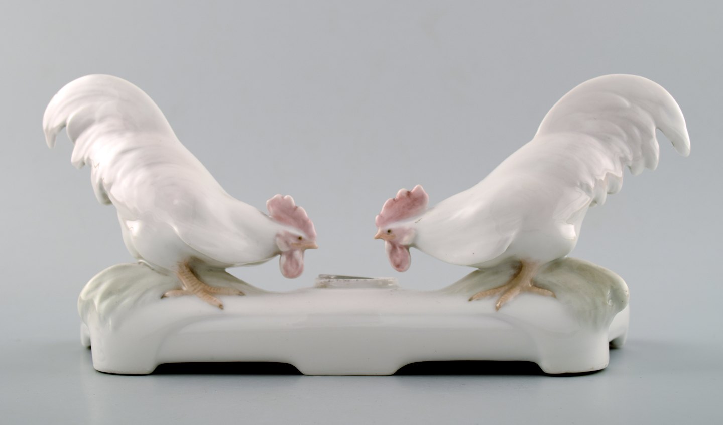 Royal Copenhagen nummer 524 blækhus med haner, designet af Christian Thomsen i 1903. Måler 12 cm. x 25 cm. I perfekt stand. 1. sortering.
