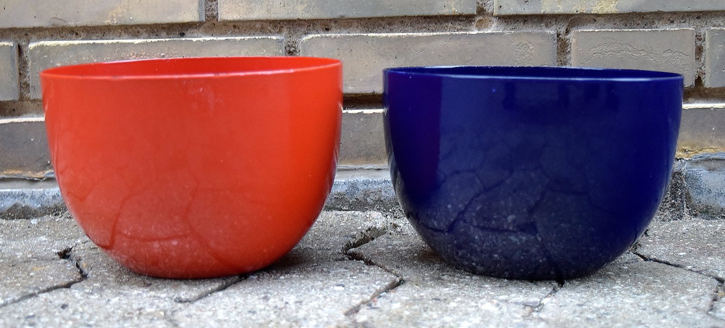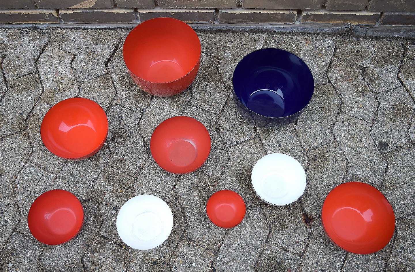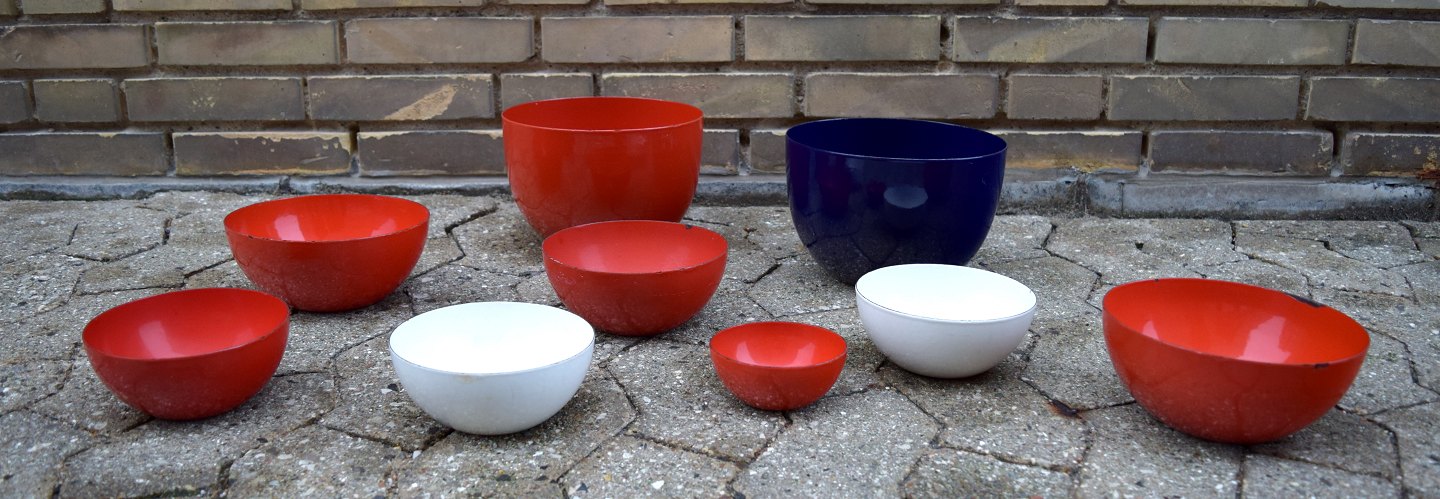 KAJ FRANCK 9 skåle, emaljeret metal, Finel, Finland, 1950´erne. Røde, blå og hvide. Diameter 10-24 cm. Højde 5-14 cm. I god stand, mindre brugspræg. Stemplet.