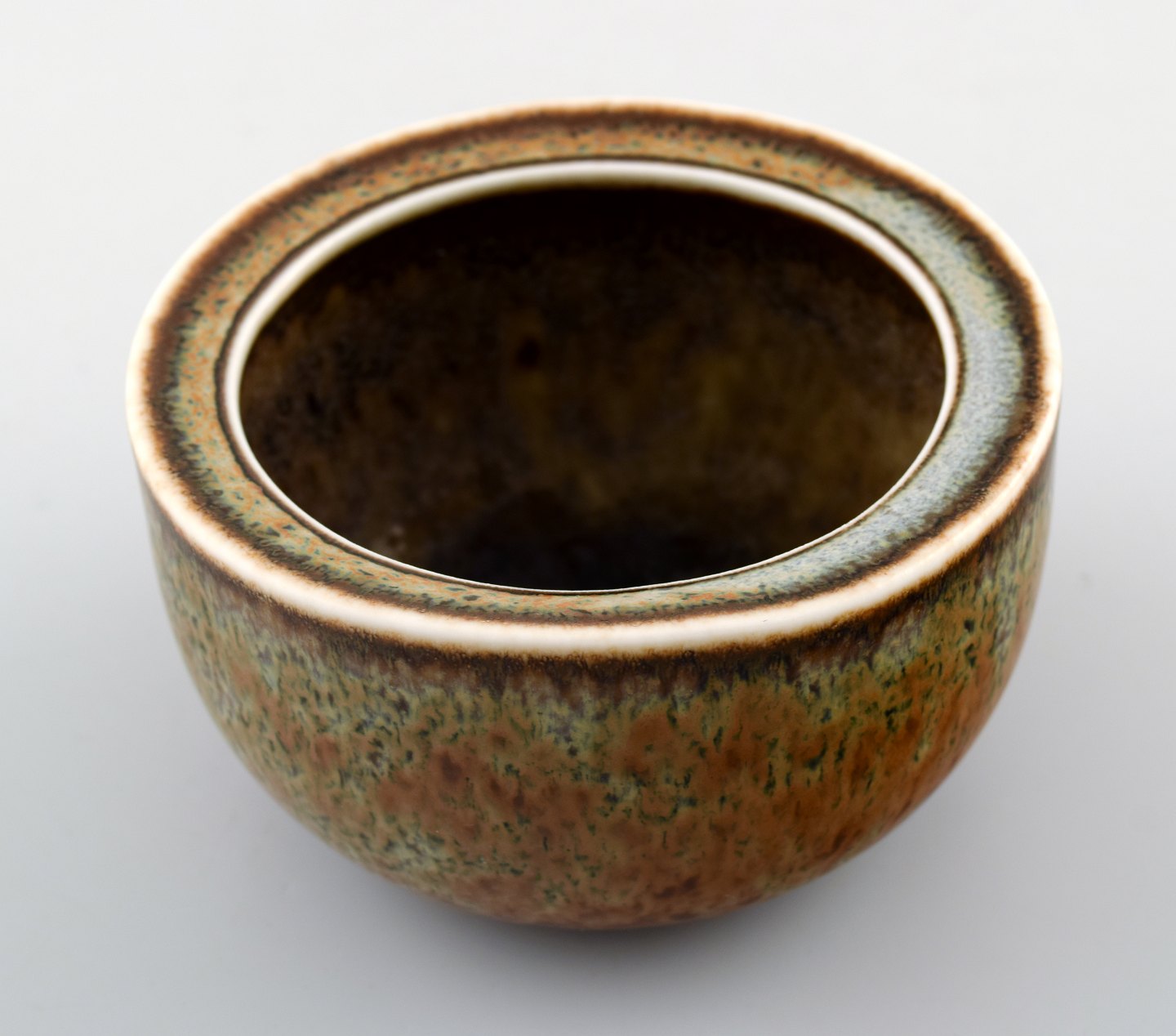 Carl-Harry Stålhane, Rørstrand, keramikskål. Smuk glasur i brungrønne nuancer. Måler 9,5 x 6 cm. I perfekt stand, 1. sortering.
