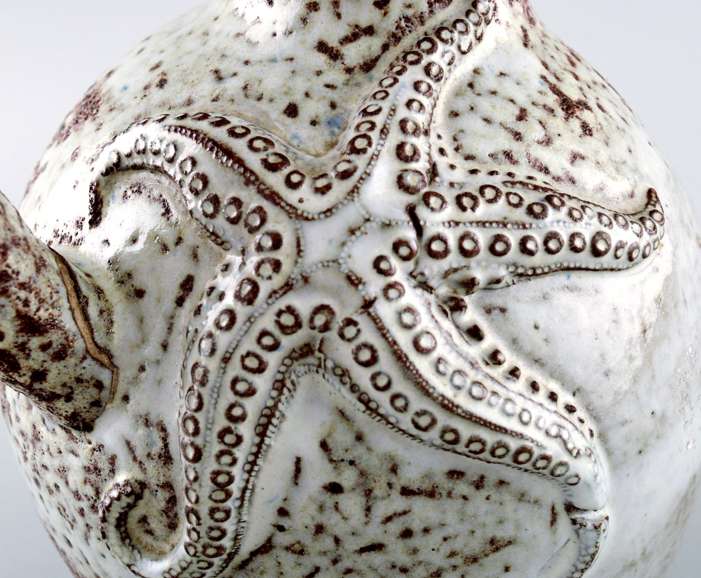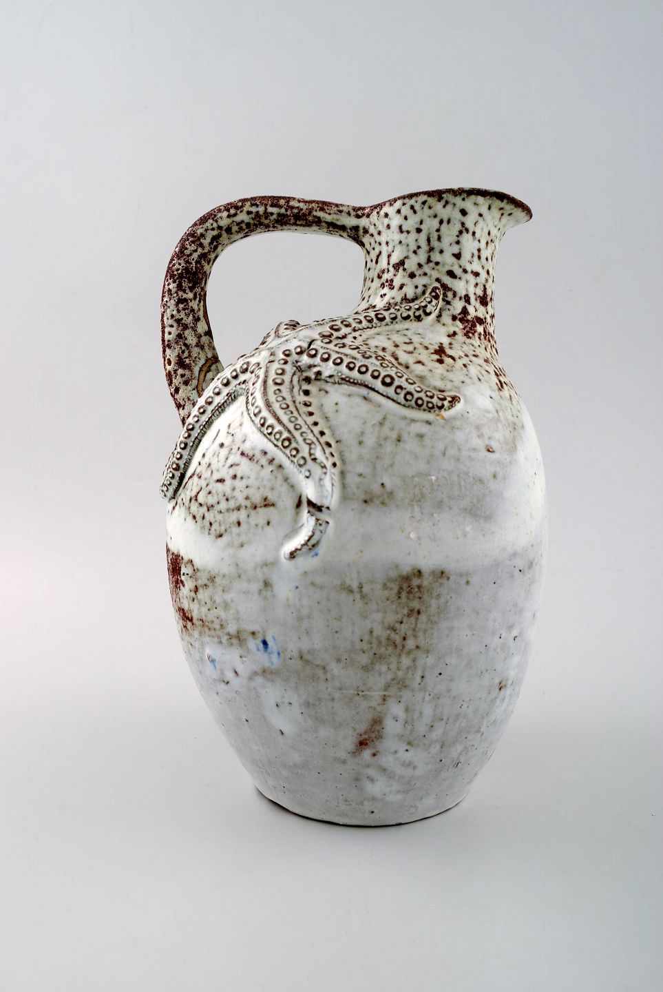 Kande af hvidglaseret stentøj udført af Gertrud Vasegaard (1913-2007), modelleret med søstjerne på siden, 1933-35.
