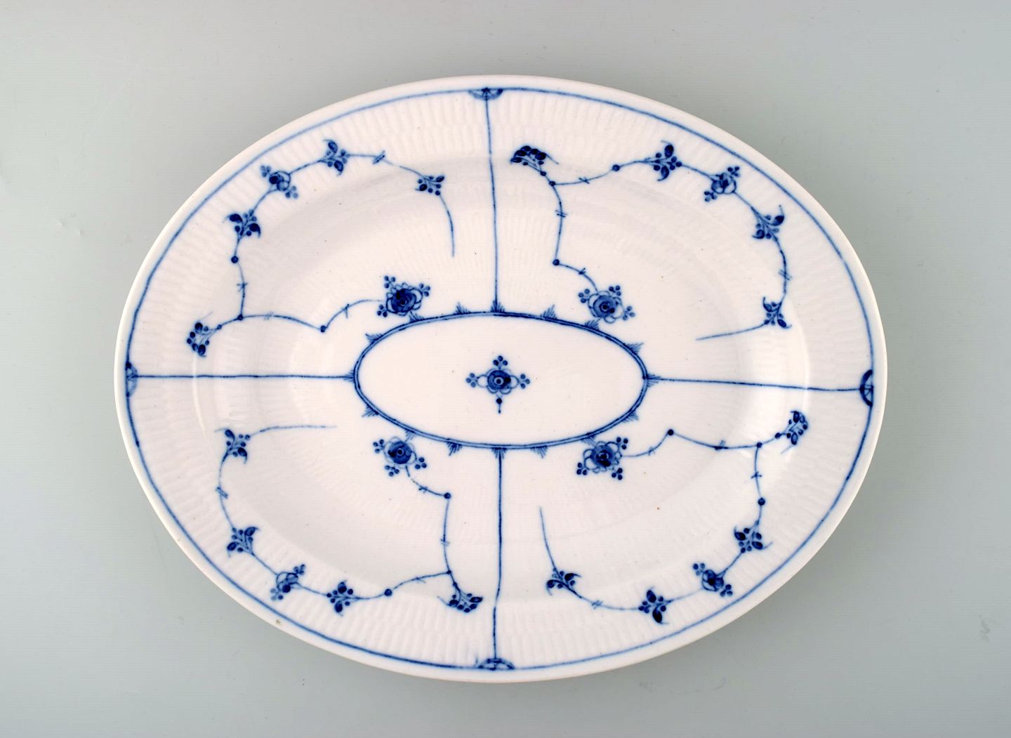 Rare and antique Royal Copenhagen Blue fluted large oval serving platter. Early 19c. Measures: 37 cm. Diameter 29 cm. Very good condition. 1st. factory quality. Marked no. 1. = painter number.