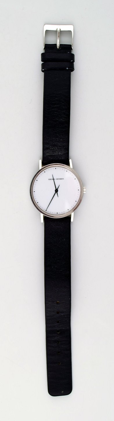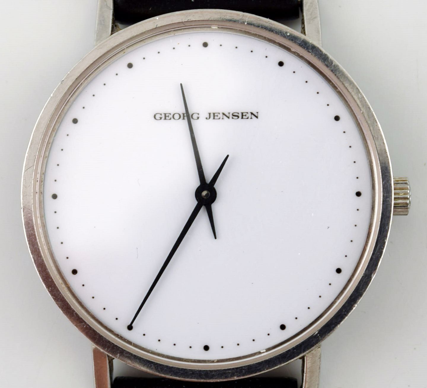 Henning Koppel: Herrearmbåndsur af stål. Udført hos Georg Jensen. Dessin 321. Quartz. Hvid skive med sorte visere og prik markører. Urets diameter 33 mm. I perfekt stand.