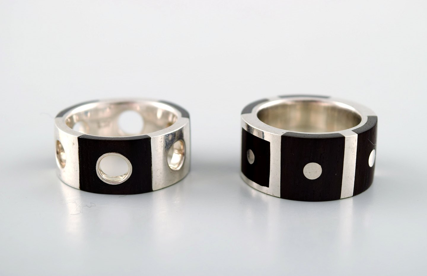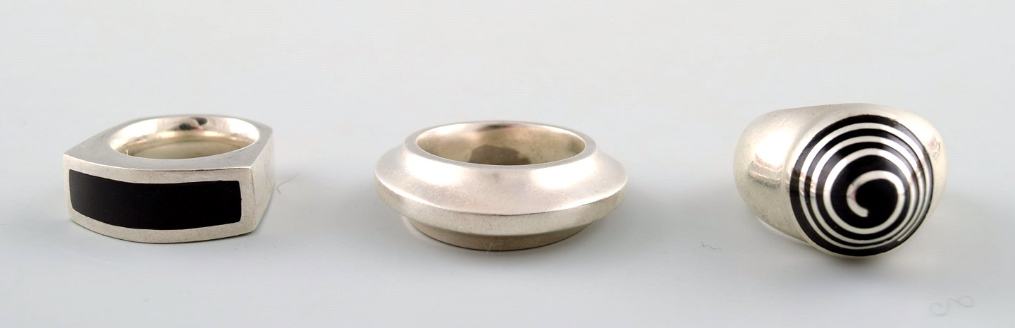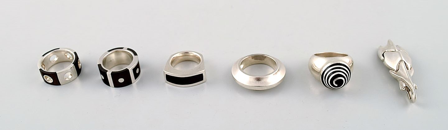 Samling smykker af sterlingsølv, de fleste med monteringer af ibenholt, bestående af 5 ringe og et vedhæng. Dansk design. Assorterede ringstørrelser. I perfekt stand.