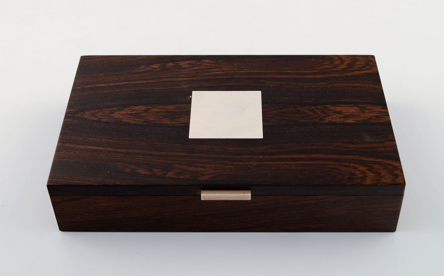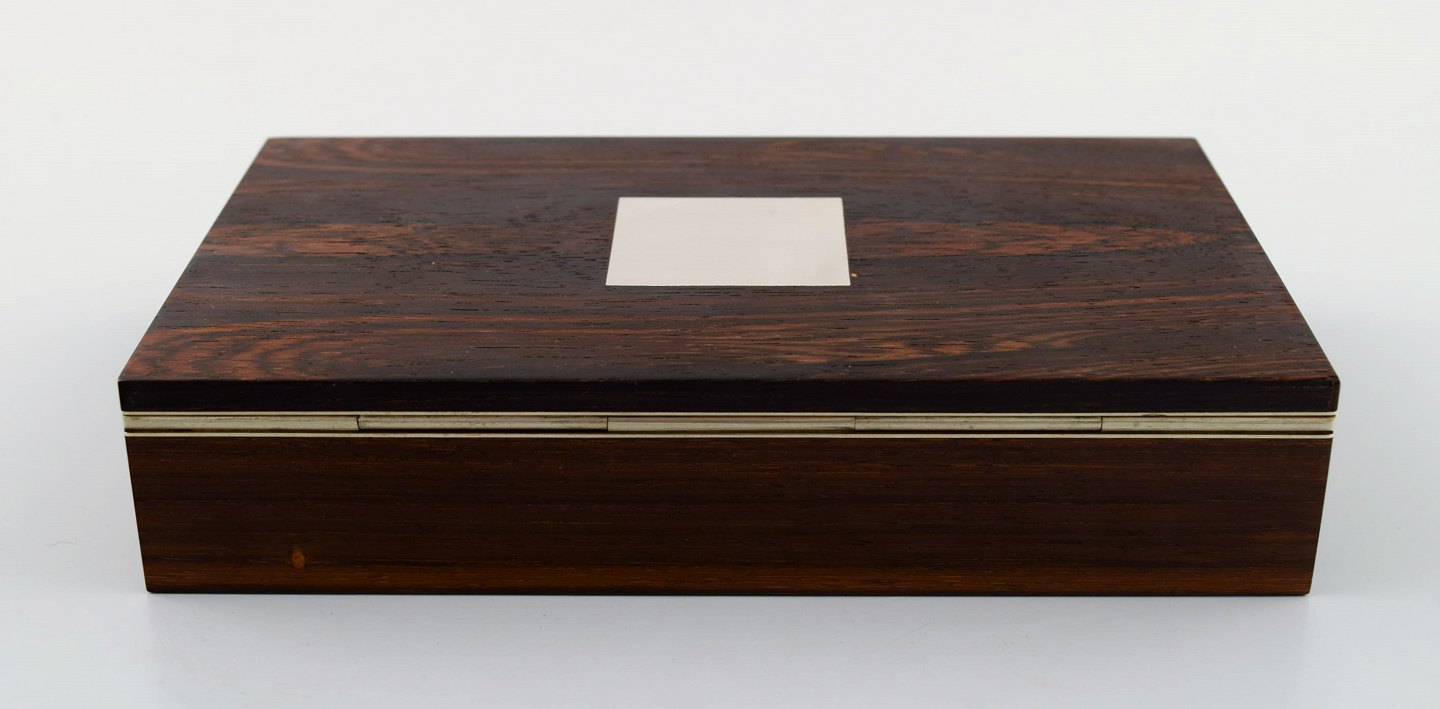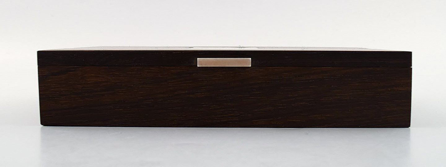 Hans Hansen: Skrin/æske i palisander med indlagt sølv. Stemplet Hans Hansen. 1950/60´erne. Måler : 18 cm. x 11 cm. x 3,5 cm. I perfekt stand.