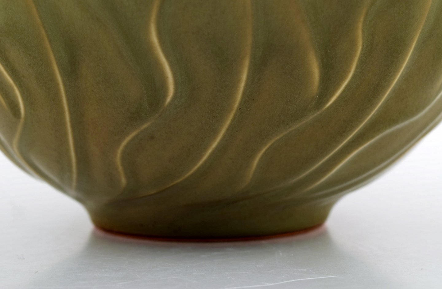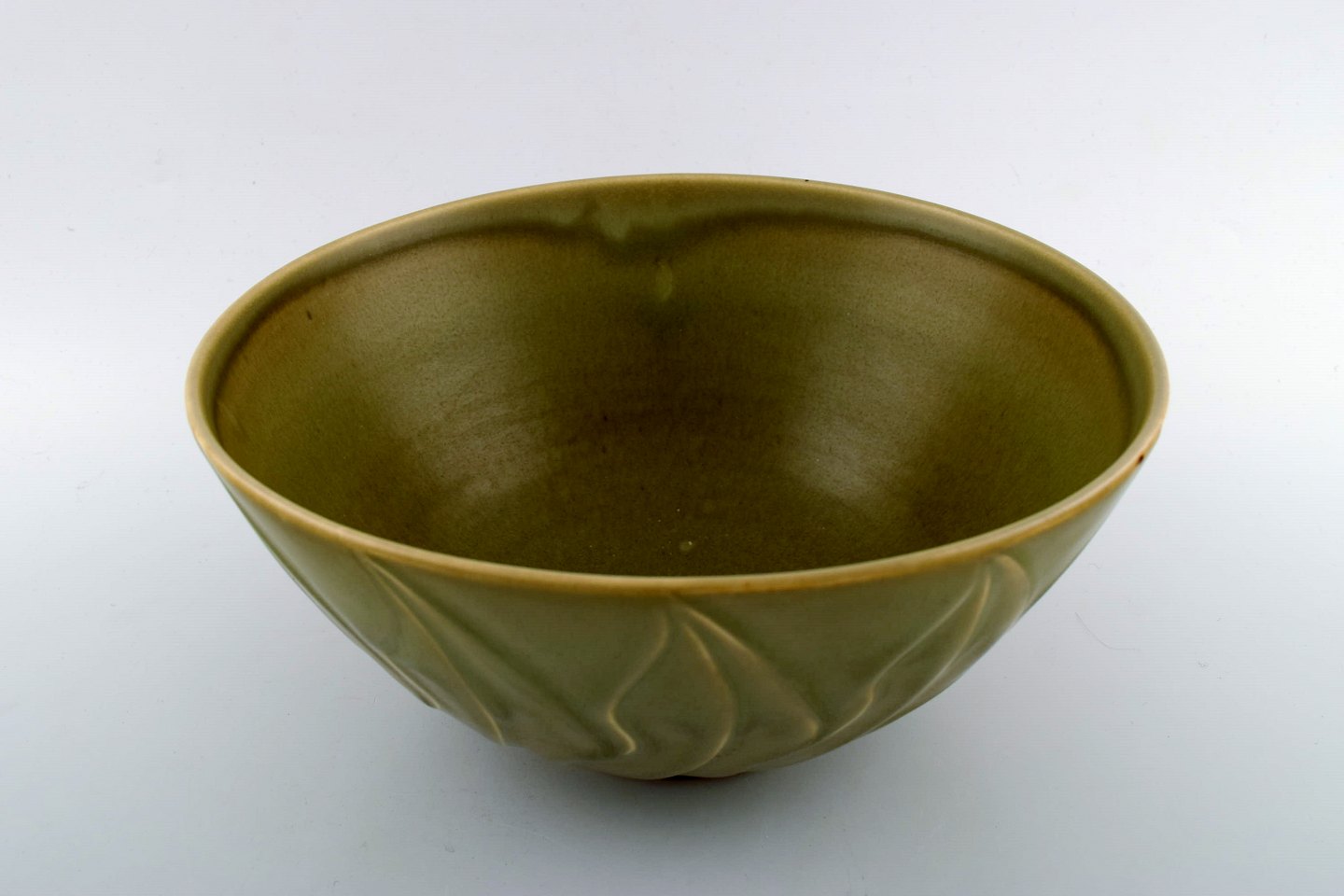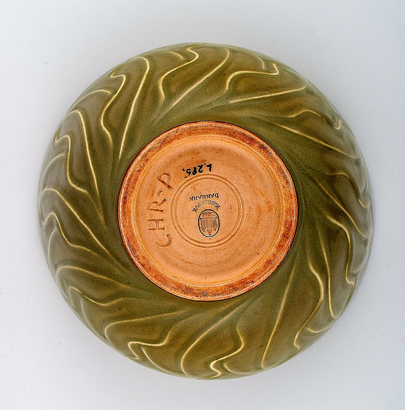 Christian Poulsen f. Kolding 1911, d. Kgs. Lyngby 1991 : Bing & Grøndahl B&G Skål af stentøj dekoreret med celadon glasur og blade.