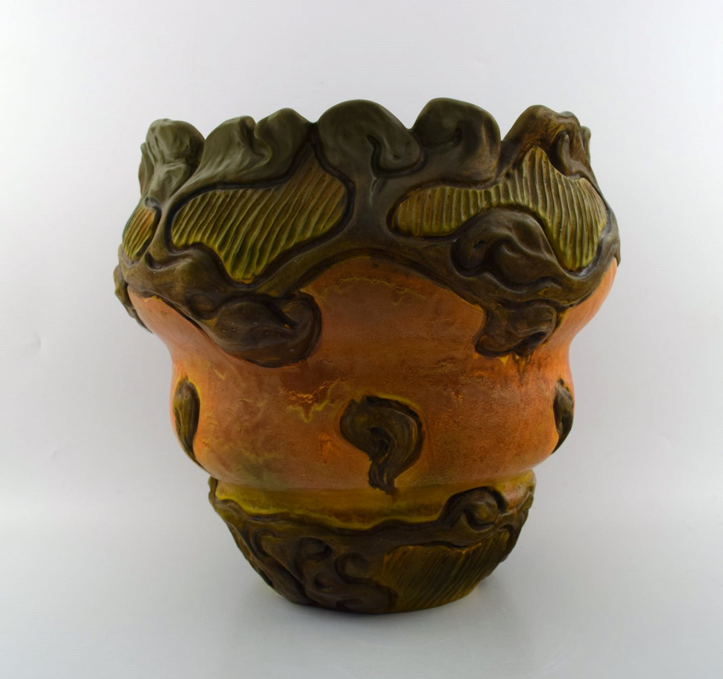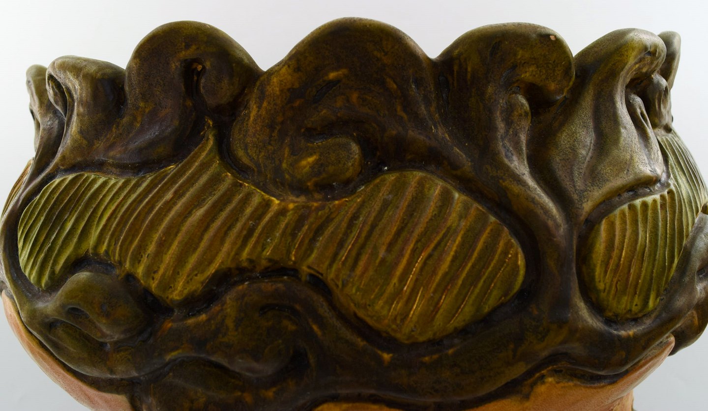 Thorvald Bindesbøll stor krukke af brunglaseret lertøj prydet med bladornamentik i relief.