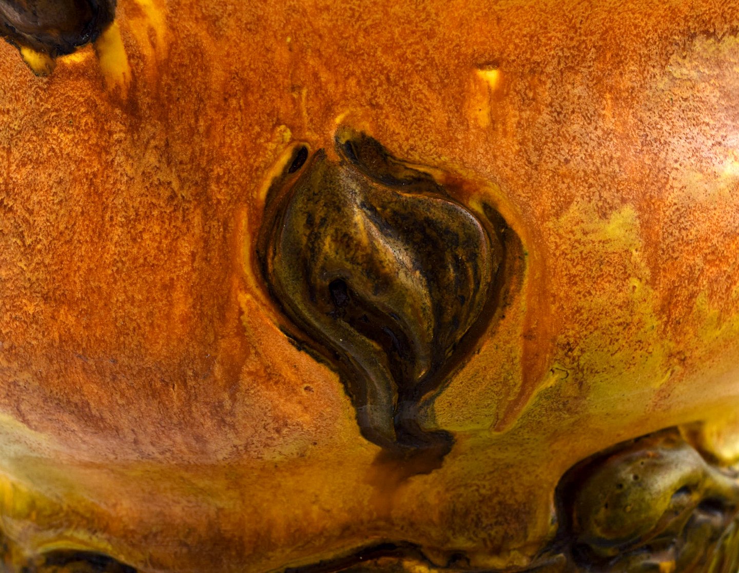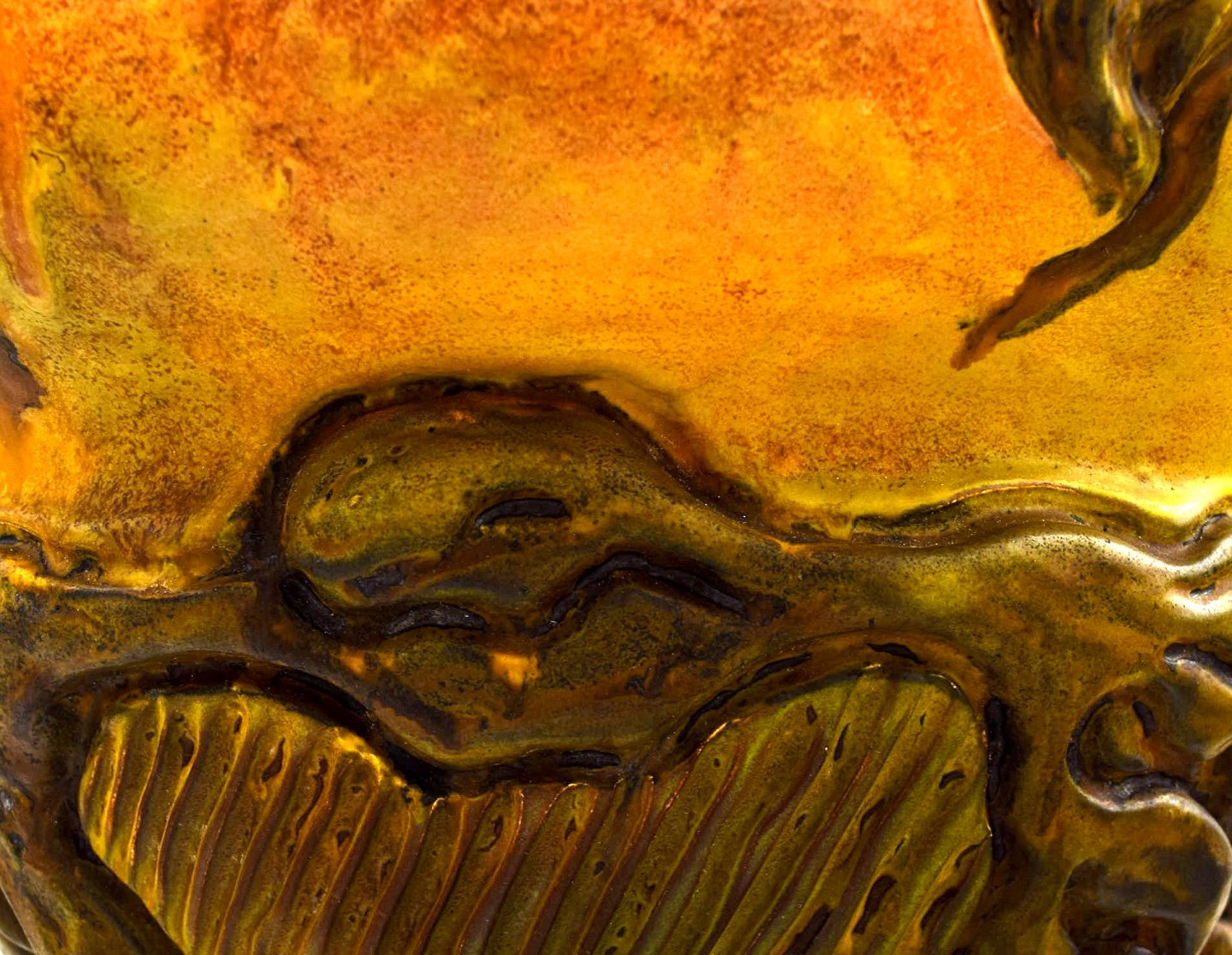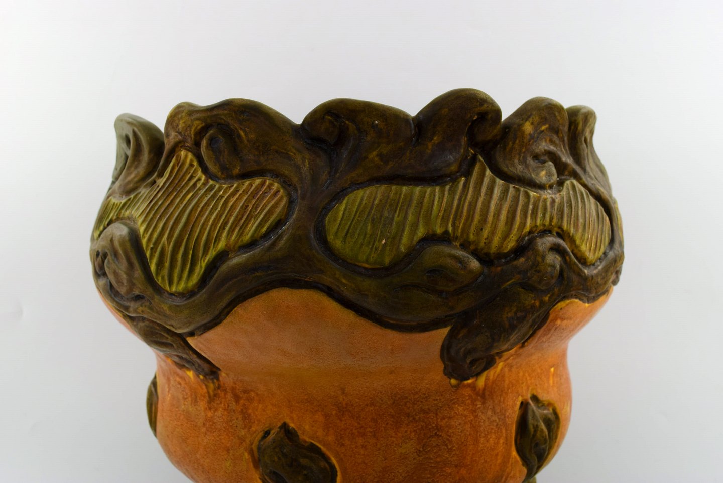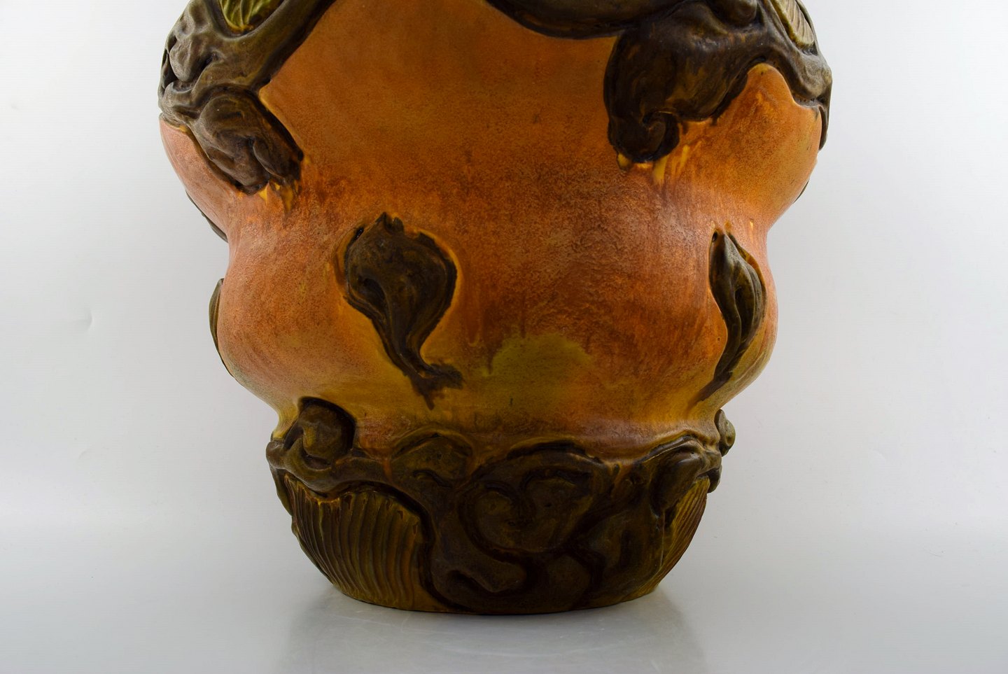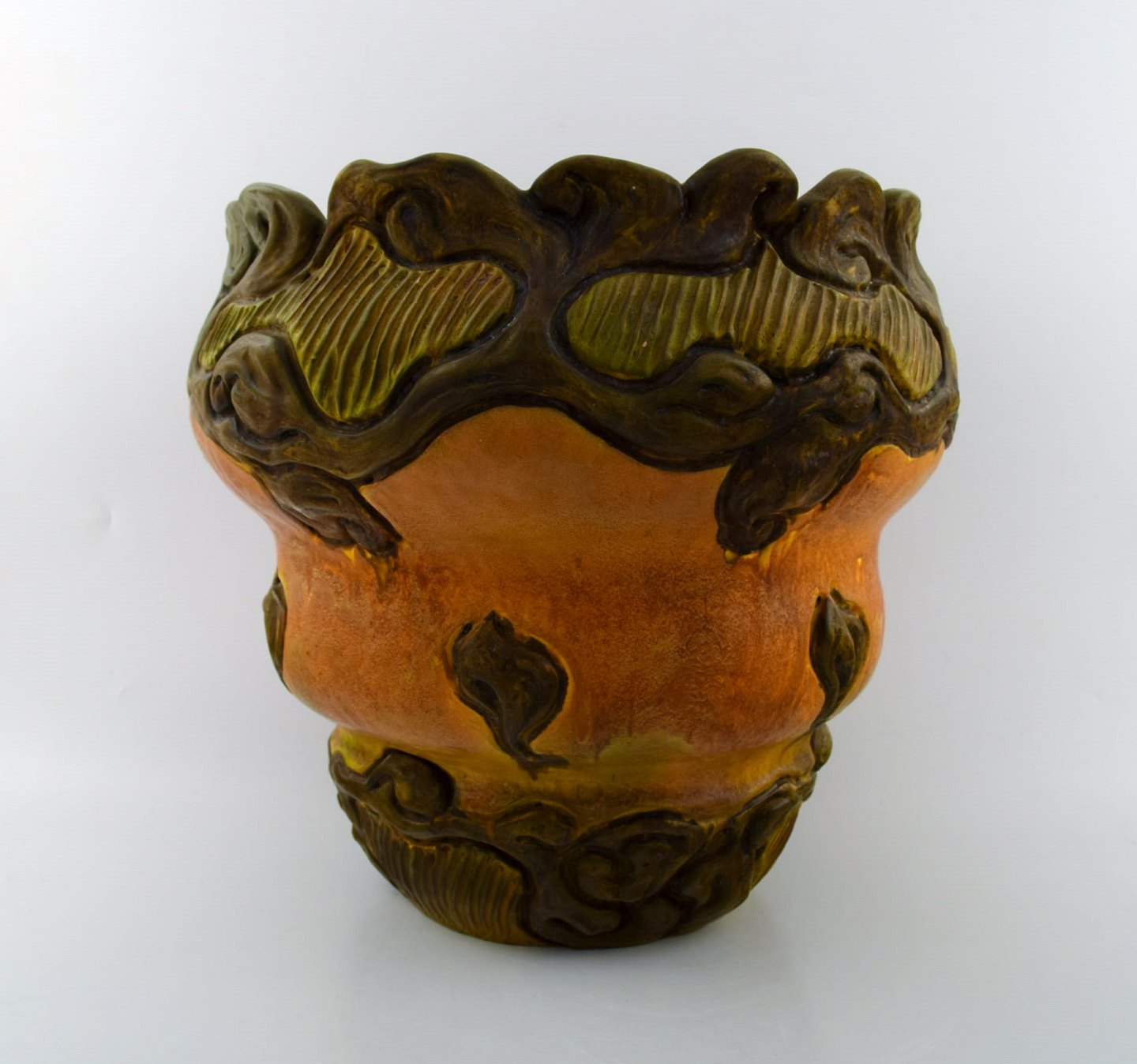 Thorvald Bindesbøll/Bindesboll huge jar of brown glazed earthenware decorated with leaf ornamentation in relief.