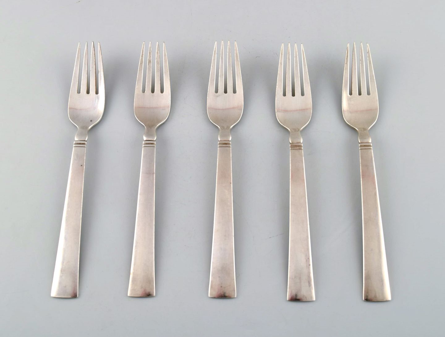 Georg Jensen Sterling Silver Block / Acadia. 5 dinner forks. Measures: 18.5 cm. Designed by Just Andersen, 1934. In perfect condition. Stamped.