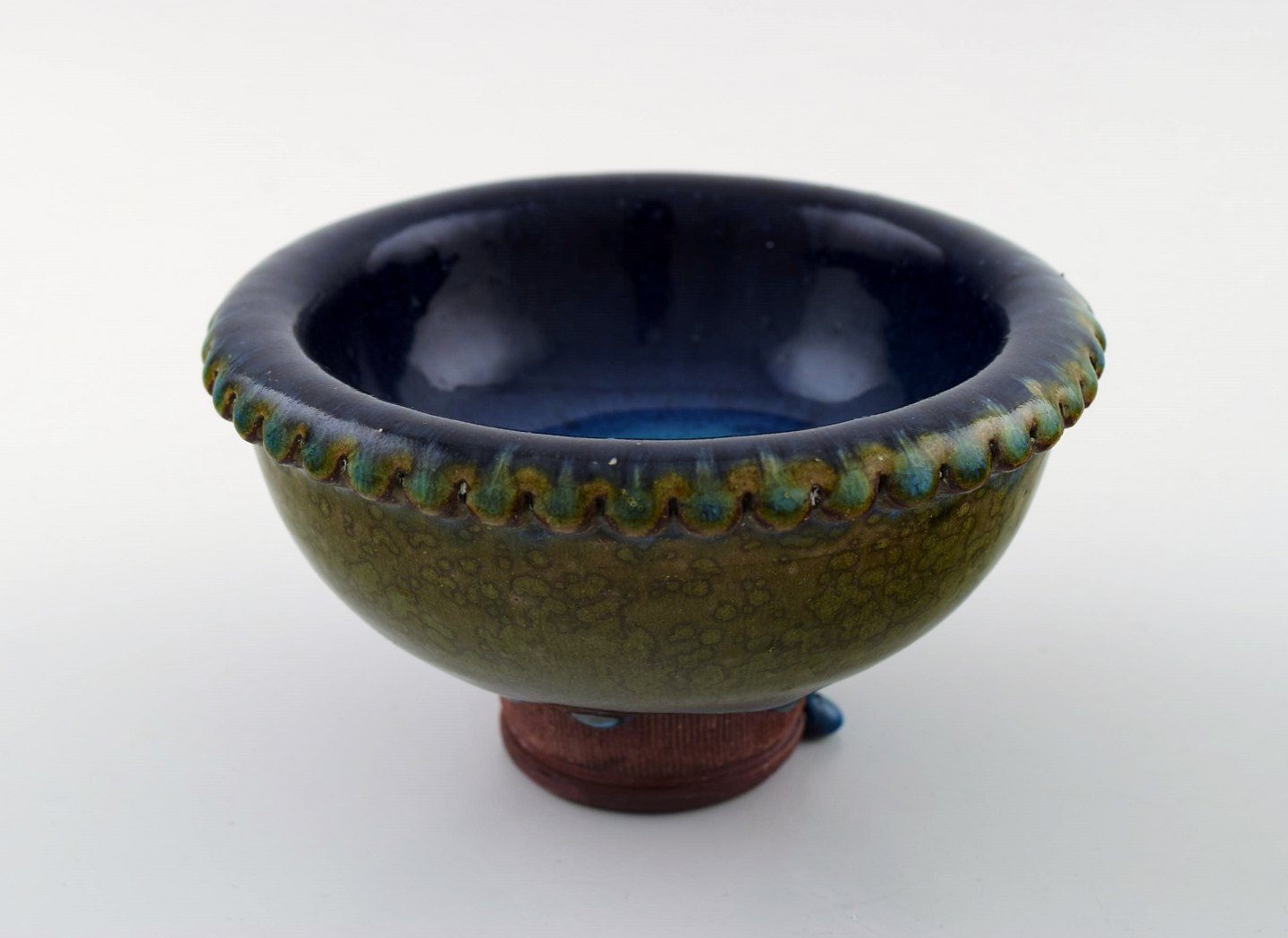 Wilhelm Kåge (1889-1960) for Gustavsberg, "Farsta". Unika skål af stentøj, dekoreret med blå og grøn glasur. Stemplet. Gustavsberg, Studio, Farsta. I perfekt stand. Måler 12 x 7 cm.