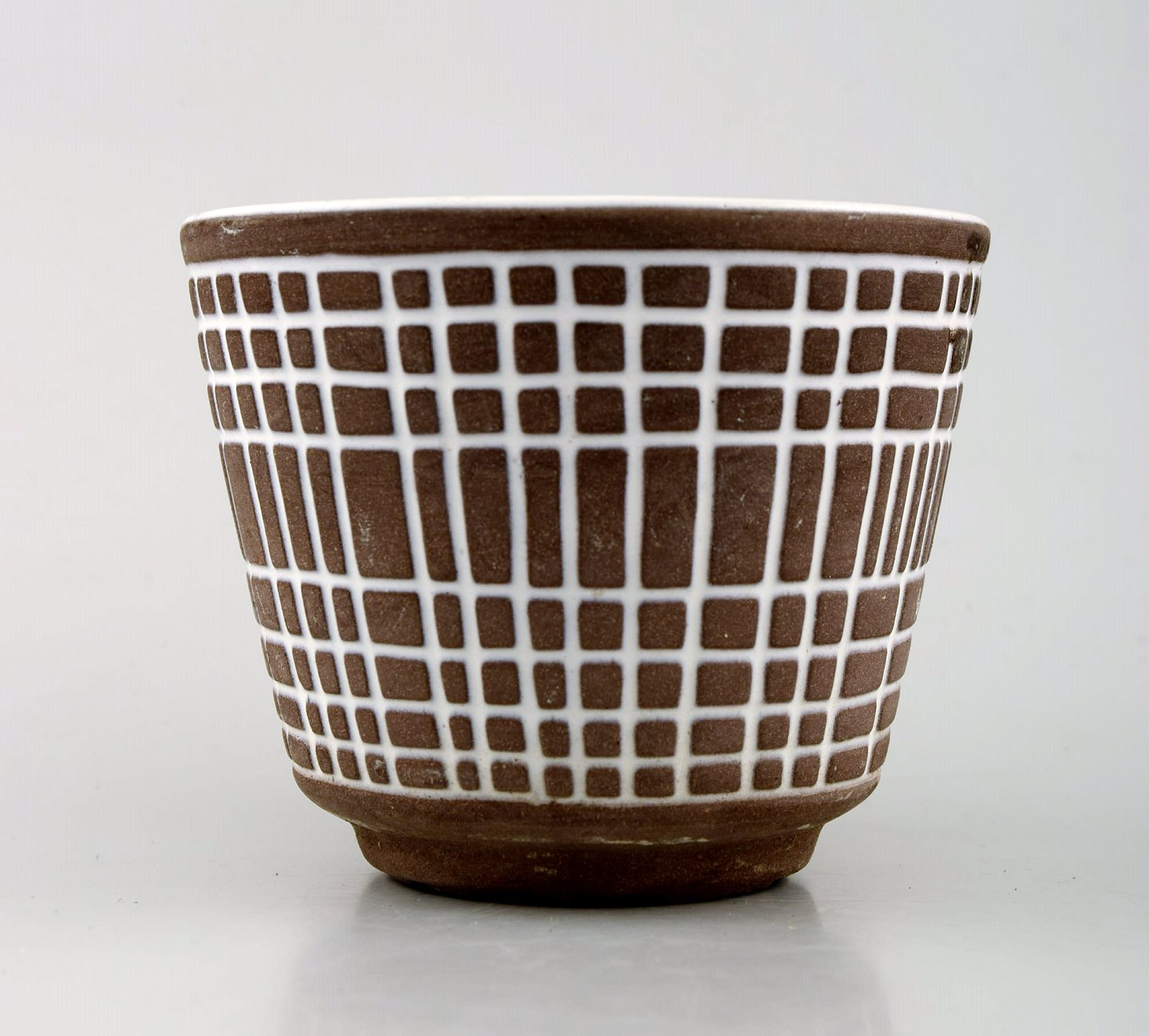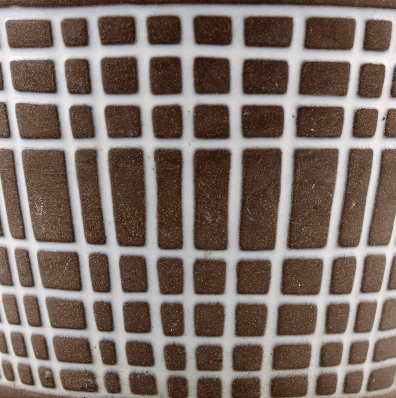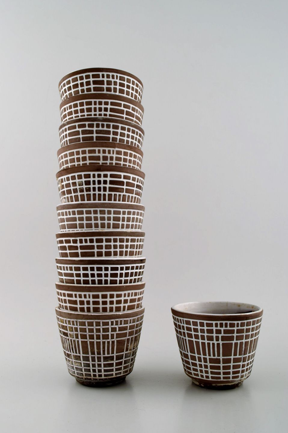 11 Upsala-Ekeby Modernist ceramics flowerpots with geometric pattern. Sweden approx. 1950s. In perfect condition. Measures 10.5 x 9 cm. Stamped.