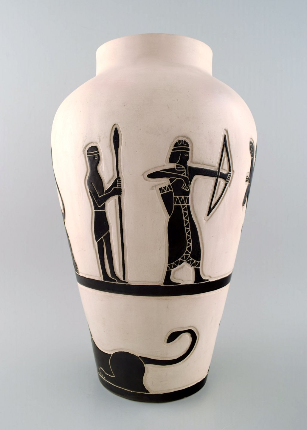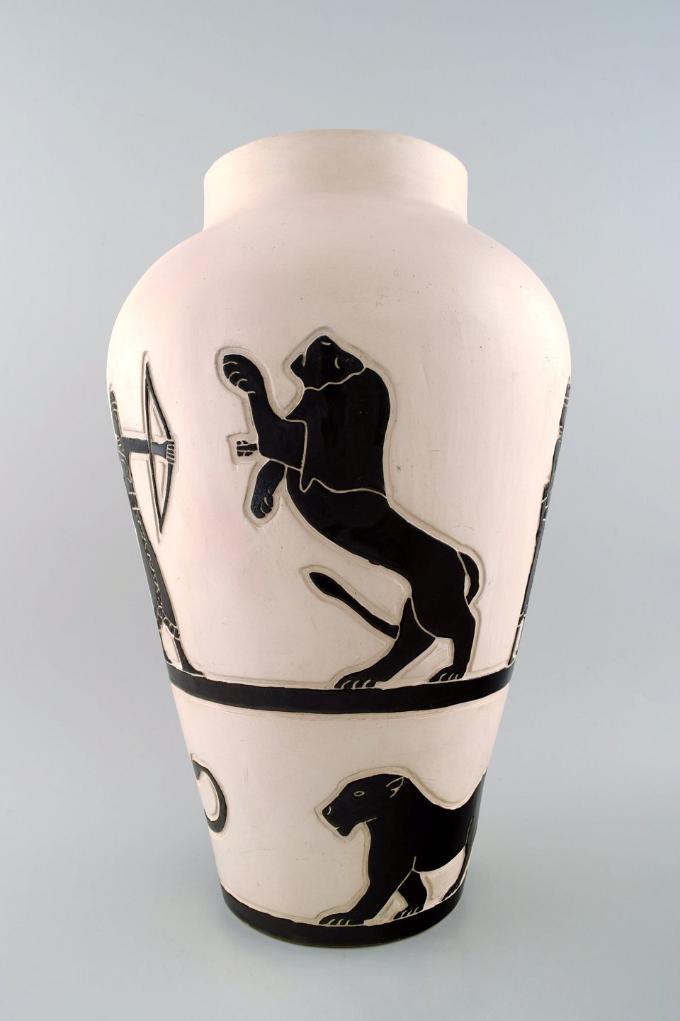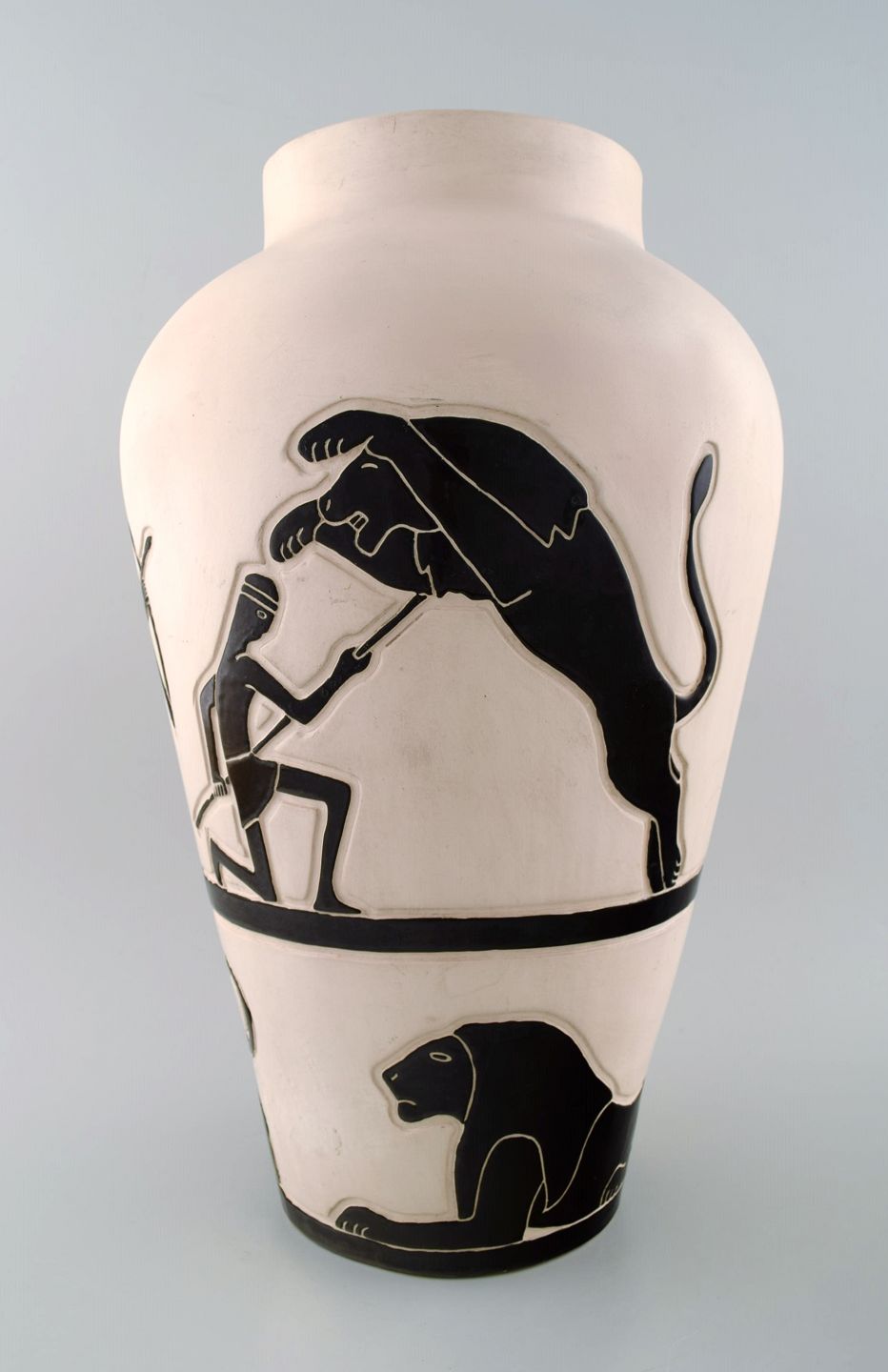 Robert Loiseleur for Lezoux, French ceramist. Large Modernist floor vase decorated with classic motifs. 1950 s. Stamped. In perfect condition. Measures: 45 cm. X 25 cm.