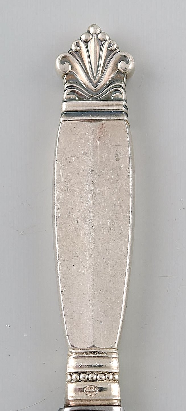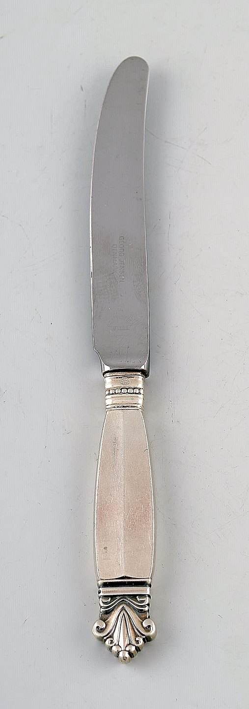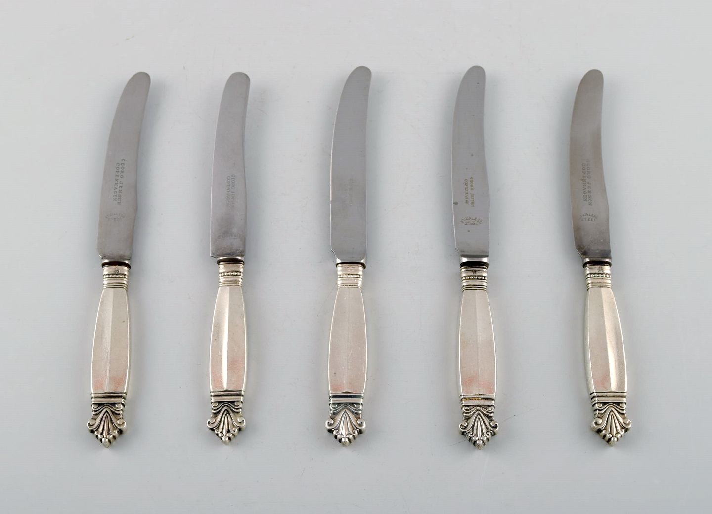 5 Early Georg Jensen Acanthus Sterling Silver, 5 Fruit Knives. Measures 17 cm. Stamped. 1908-1914. In very good condition.