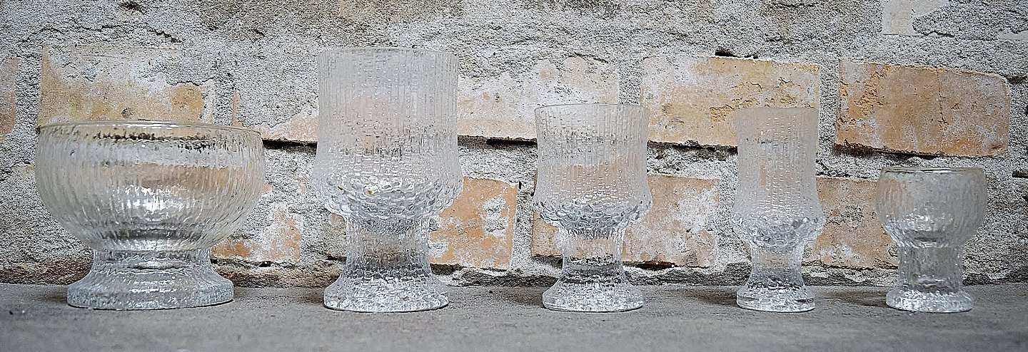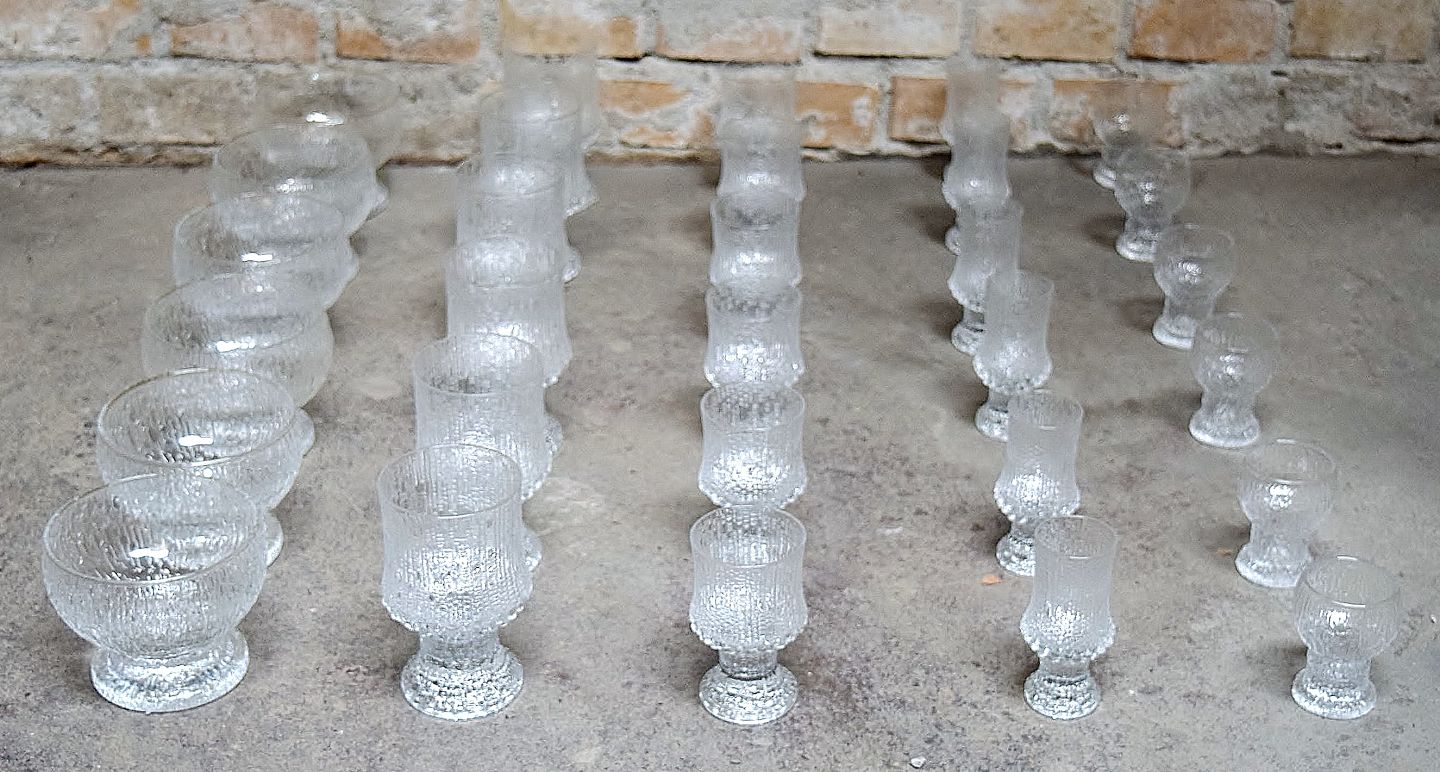 30 glas Iittala Ultima Kekkerit glas-service, moderne finsk glas, designet af Timo Sarpaneva. Komplet glasservice til 6 personer. I perfekt stand. Højeste måler : 11 cm.