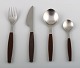 Komplet middagsservice til 6 p., Henning Koppel. Strata bestik af rustfrit stål og brun plast. Fremstillet hos Georg Jensen.