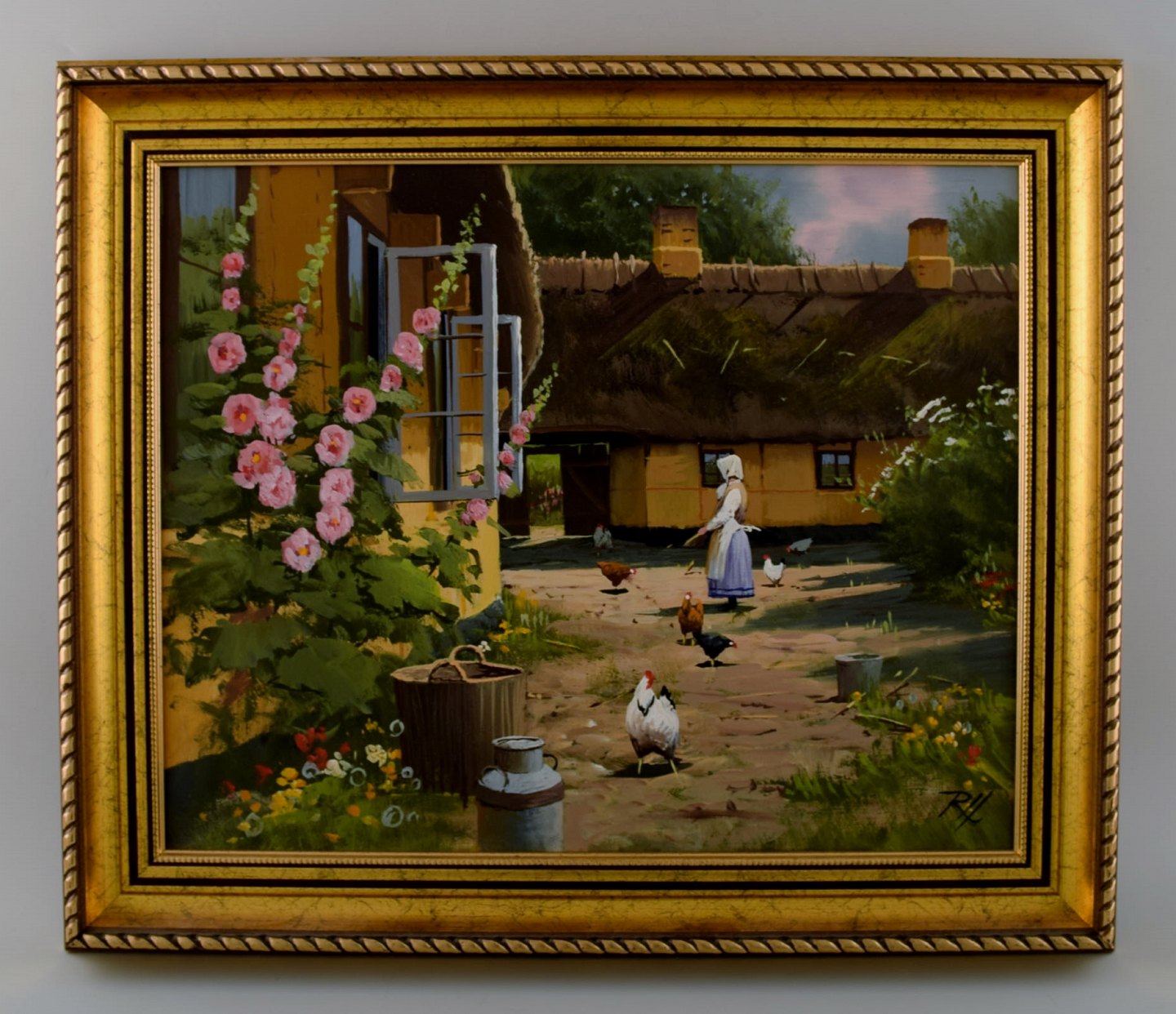 Olie på lærred, Roald Hansen (Født 1938) Idyllisk exteriør med stråtækt hus og høns på gårdspladsen. Måler 32 x 40 cm. Signeret RH. I perfekt stand. Guldrammen er 4,5 cm. bred og i perfekt stand.
