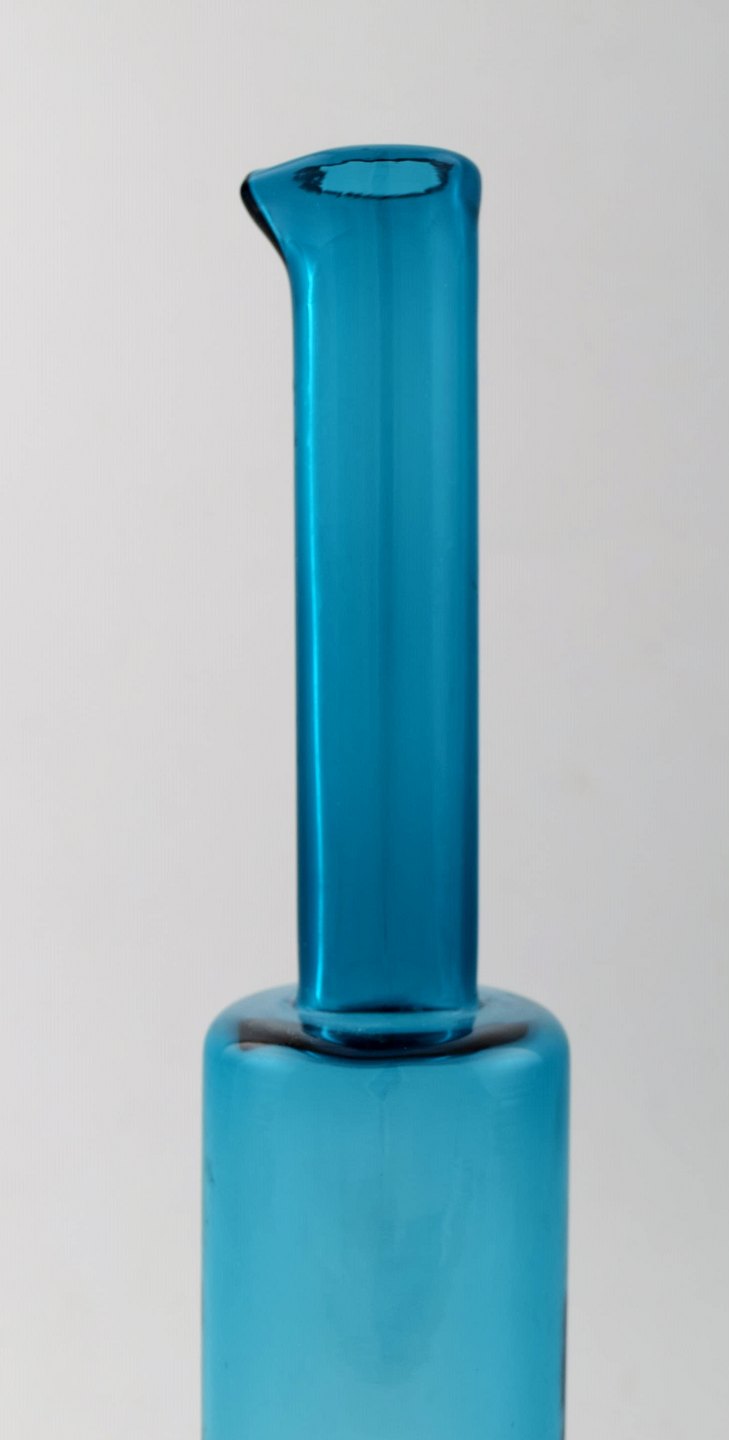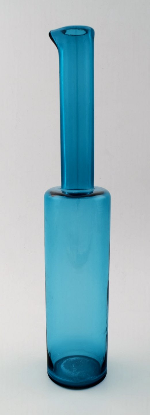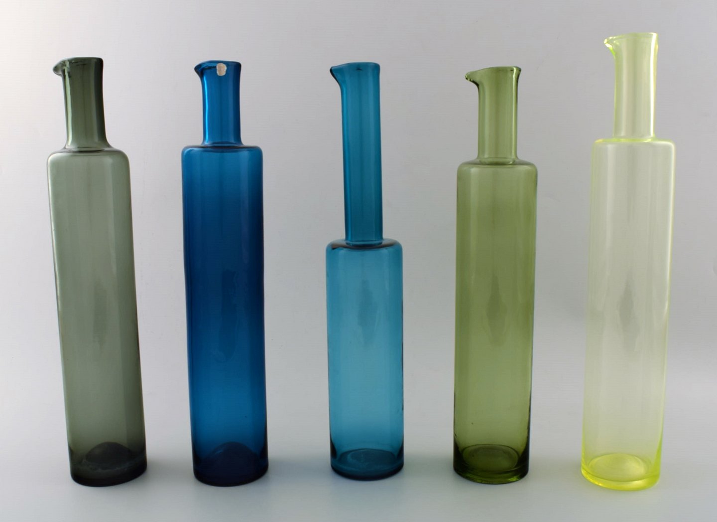 Nanny Still for Riihimäen Lasi, Finnish glass art 5 decoration bottles, vases / pitchers. In perfect condition. Beautiful colors. 1960 / 70s. Measures 32 cm. All stamped.